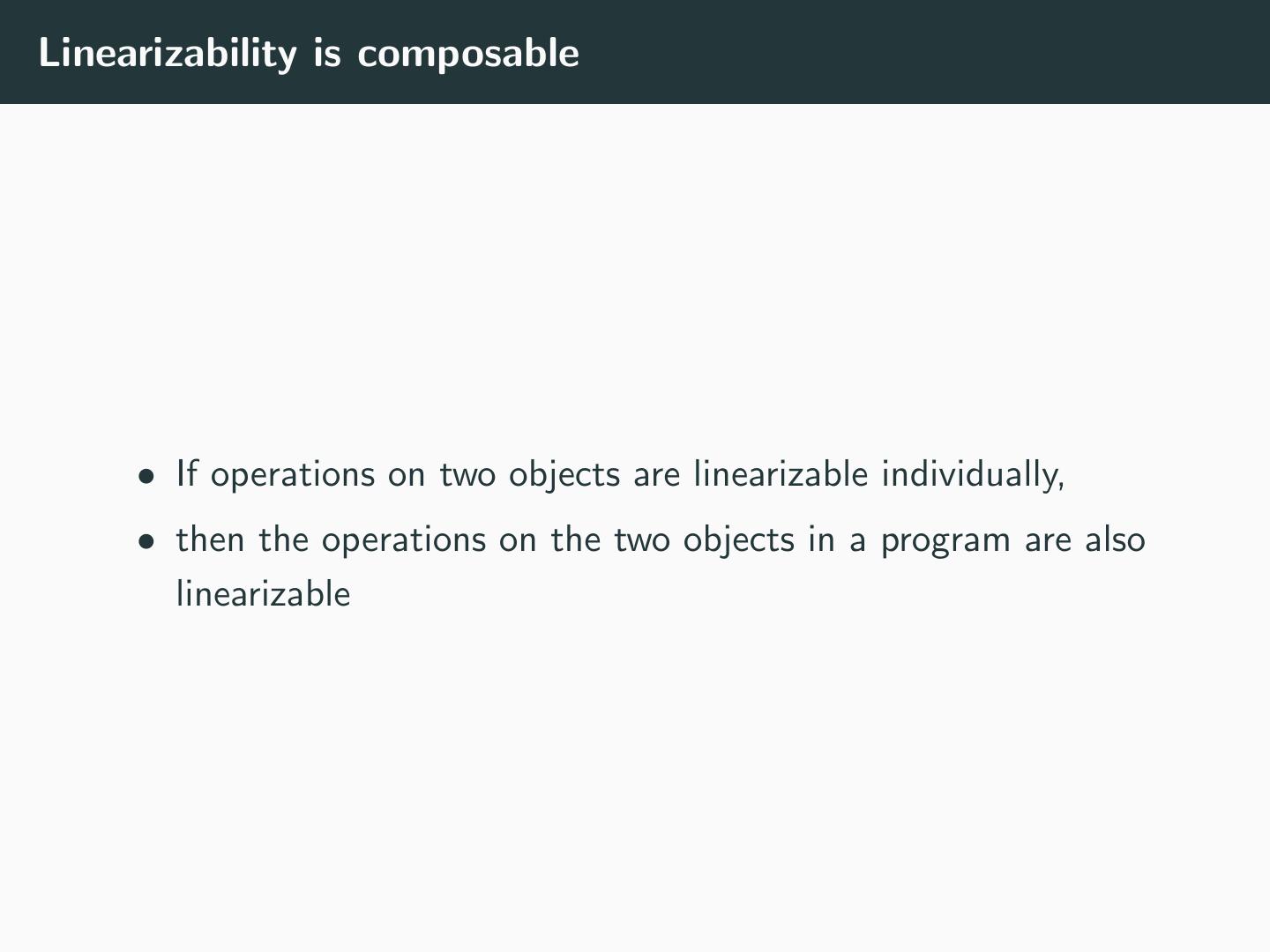 20 .Linearizability is composable • If operations on two objects are linearizable individually, • then the operations on the two objects in a program are also linearizable