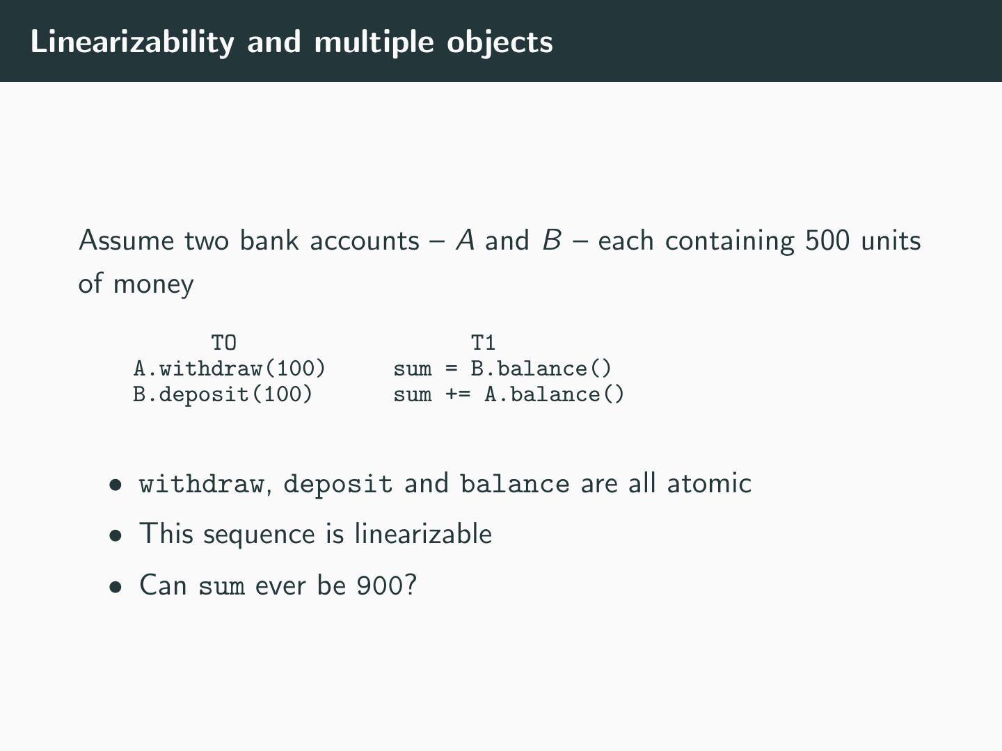 21 .Linearizability and multiple objects Assume two bank accounts – A and B – each containing 500 units of money TO T1 A.withdraw(100) sum = B.balance() B.deposit(100) sum += A.balance() • withdraw, deposit and balance are all atomic • This sequence is linearizable • Can sum ever be 900?