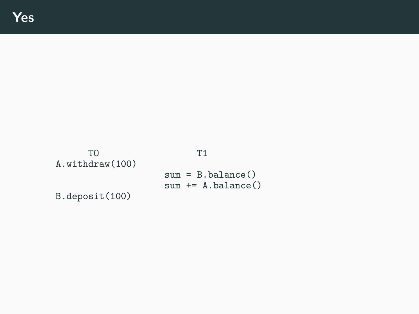 22 .Yes TO T1 A.withdraw(100) sum = B.balance() sum += A.balance() B.deposit(100)