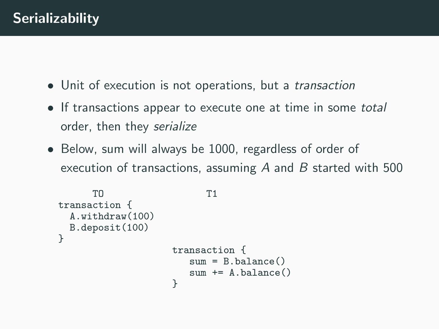23 .Serializability • Unit of execution is not operations, but a transaction • If transactions appear to execute one at time in some total order, then they serialize • Below, sum will always be 1000, regardless of order of execution of transactions, assuming A and B started with 500 TO T1 transaction { A.withdraw(100) B.deposit(100) } transaction { sum = B.balance() sum += A.balance() }