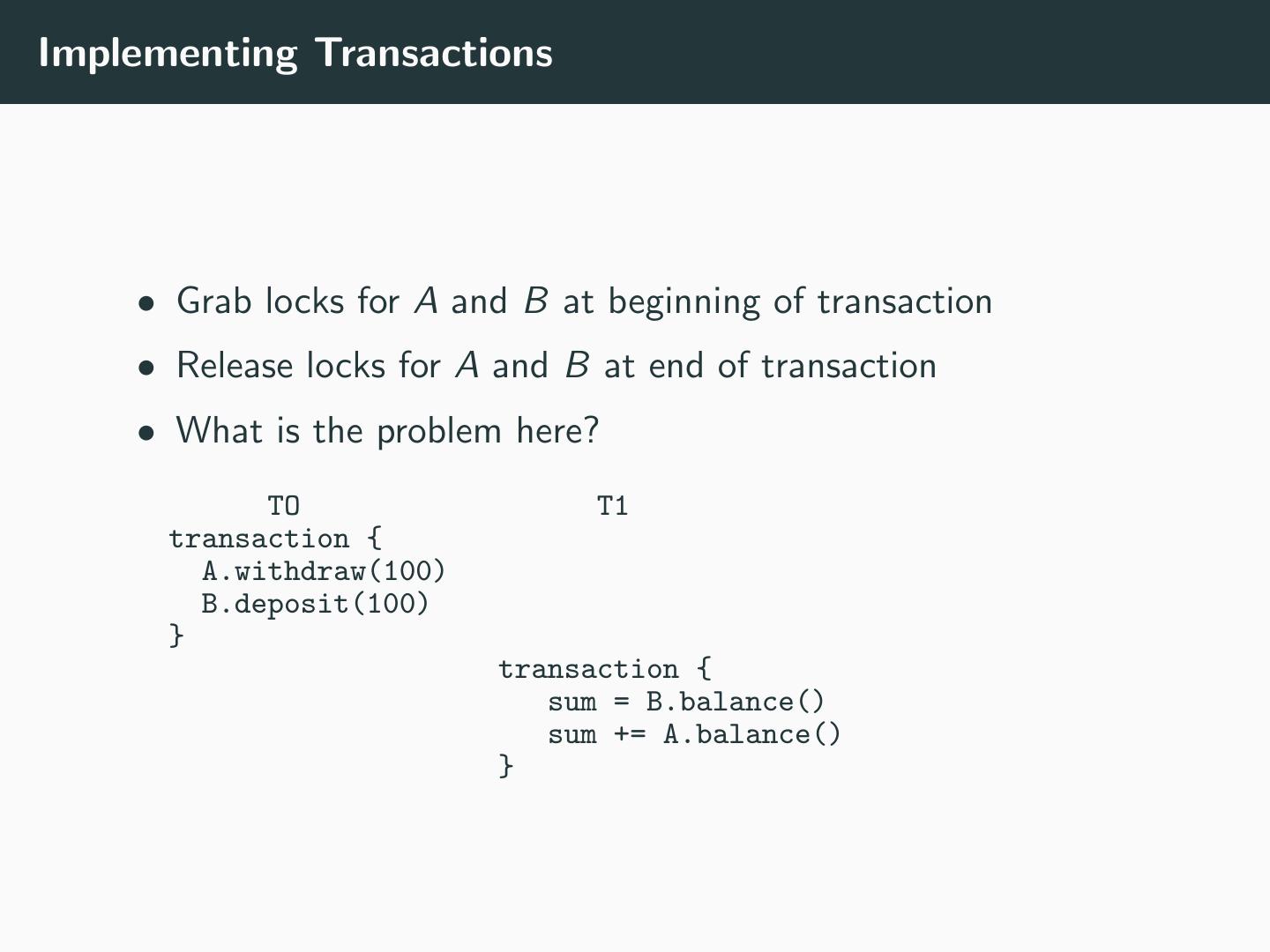 24 .Implementing Transactions • Grab locks for A and B at beginning of transaction • Release locks for A and B at end of transaction • What is the problem here? TO T1 transaction { A.withdraw(100) B.deposit(100) } transaction { sum = B.balance() sum += A.balance() }