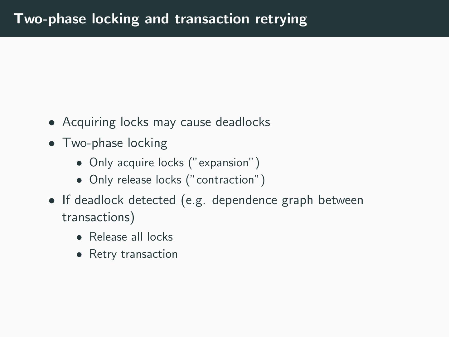 25 .Two-phase locking and transaction retrying • Acquiring locks may cause deadlocks • Two-phase locking • Only acquire locks (”expansion”) • Only release locks (”contraction”) • If deadlock detected (e.g. dependence graph between transactions) • Release all locks • Retry transaction