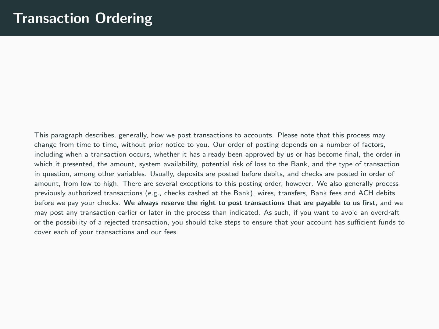 26 .Transaction Ordering This paragraph describes, generally, how we post transactions to accounts. Please note that this process may change from time to time, without prior notice to you. Our order of posting depends on a number of factors, including when a transaction occurs, whether it has already been approved by us or has become final, the order in which it presented, the amount, system availability, potential risk of loss to the Bank, and the type of transaction in question, among other variables. Usually, deposits are posted before debits, and checks are posted in order of amount, from low to high. There are several exceptions to this posting order, however. We also generally process previously authorized transactions (e.g., checks cashed at the Bank), wires, transfers, Bank fees and ACH debits before we pay your checks. We always reserve the right to post transactions that are payable to us first, and we may post any transaction earlier or later in the process than indicated. As such, if you want to avoid an overdraft or the possibility of a rejected transaction, you should take steps to ensure that your account has sufficient funds to cover each of your transactions and our fees.