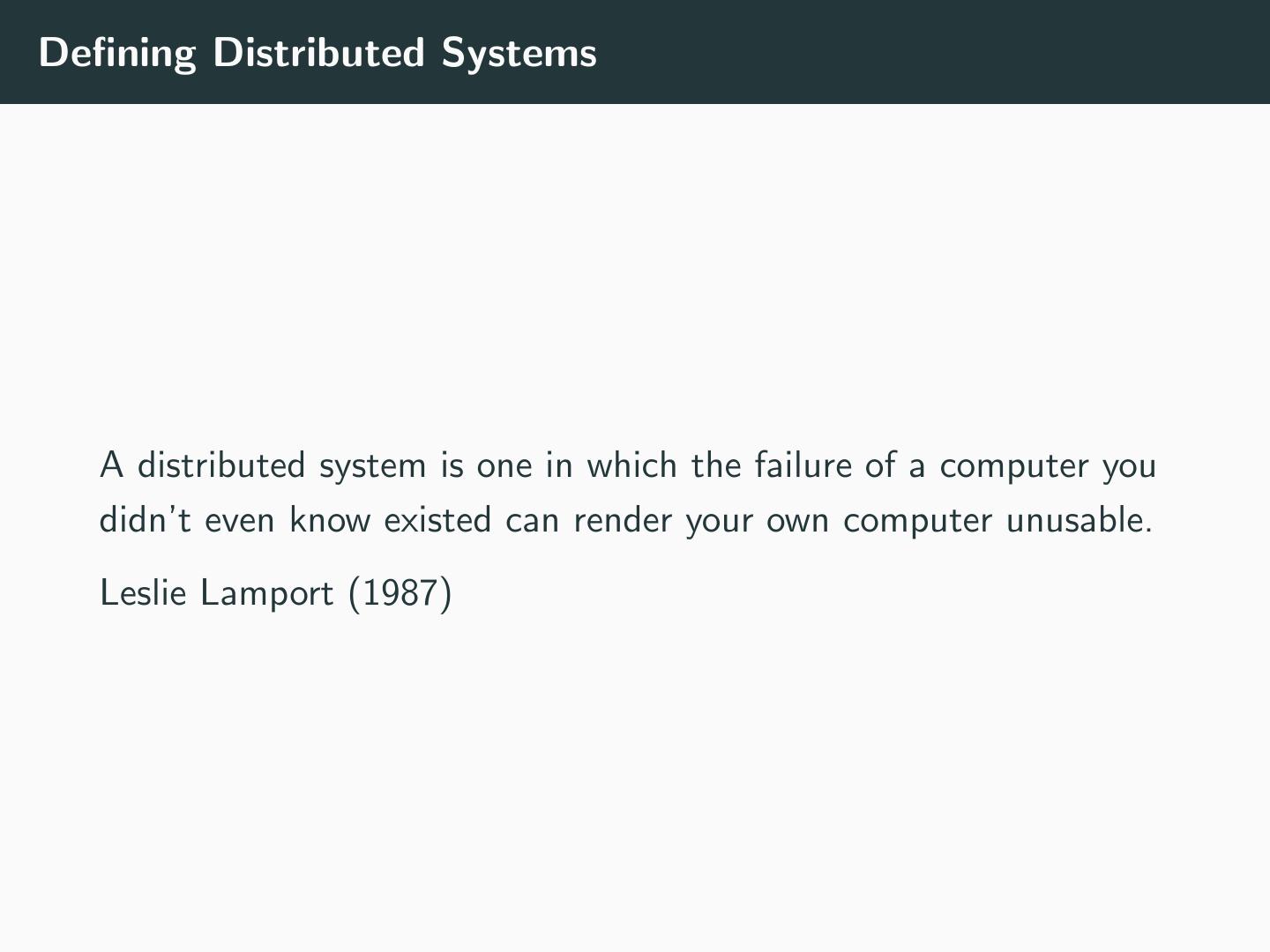 4 .Defining Distributed Systems A distributed system is one in which the failure of a computer you didn’t even know existed can render your own computer unusable. Leslie Lamport (1987)