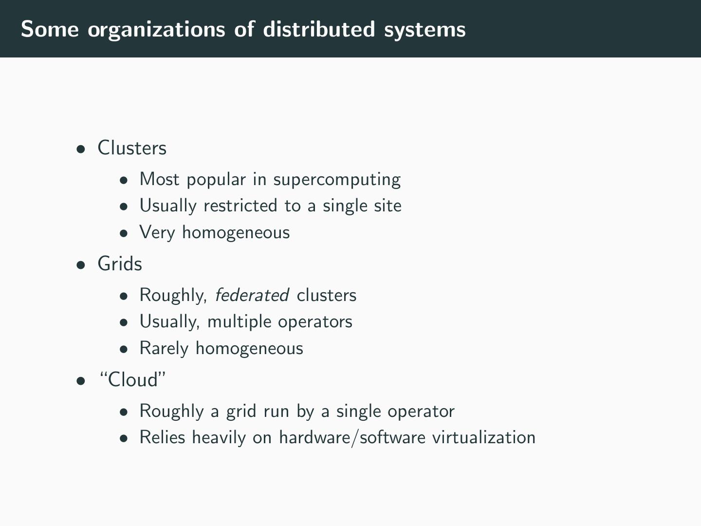 6 .Some organizations of distributed systems • Clusters • Most popular in supercomputing • Usually restricted to a single site • Very homogeneous • Grids • Roughly, federated clusters • Usually, multiple operators • Rarely homogeneous • “Cloud” • Roughly a grid run by a single operator • Relies heavily on hardware/software virtualization