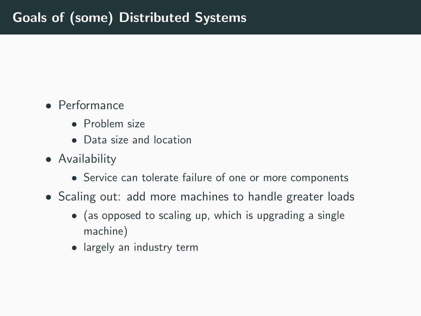 7 .Goals of (some) Distributed Systems • Performance • Problem size • Data size and location • Availability • Service can tolerate failure of one or more components • Scaling out: add more machines to handle greater loads • (as opposed to scaling up, which is upgrading a single machine) • largely an industry term