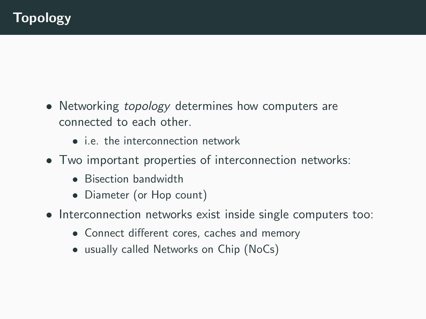 9 .Topology • Networking topology determines how computers are connected to each other. • i.e. the interconnection network • Two important properties of interconnection networks: • Bisection bandwidth • Diameter (or Hop count) • Interconnection networks exist inside single computers too: • Connect different cores, caches and memory • usually called Networks on Chip (NoCs)