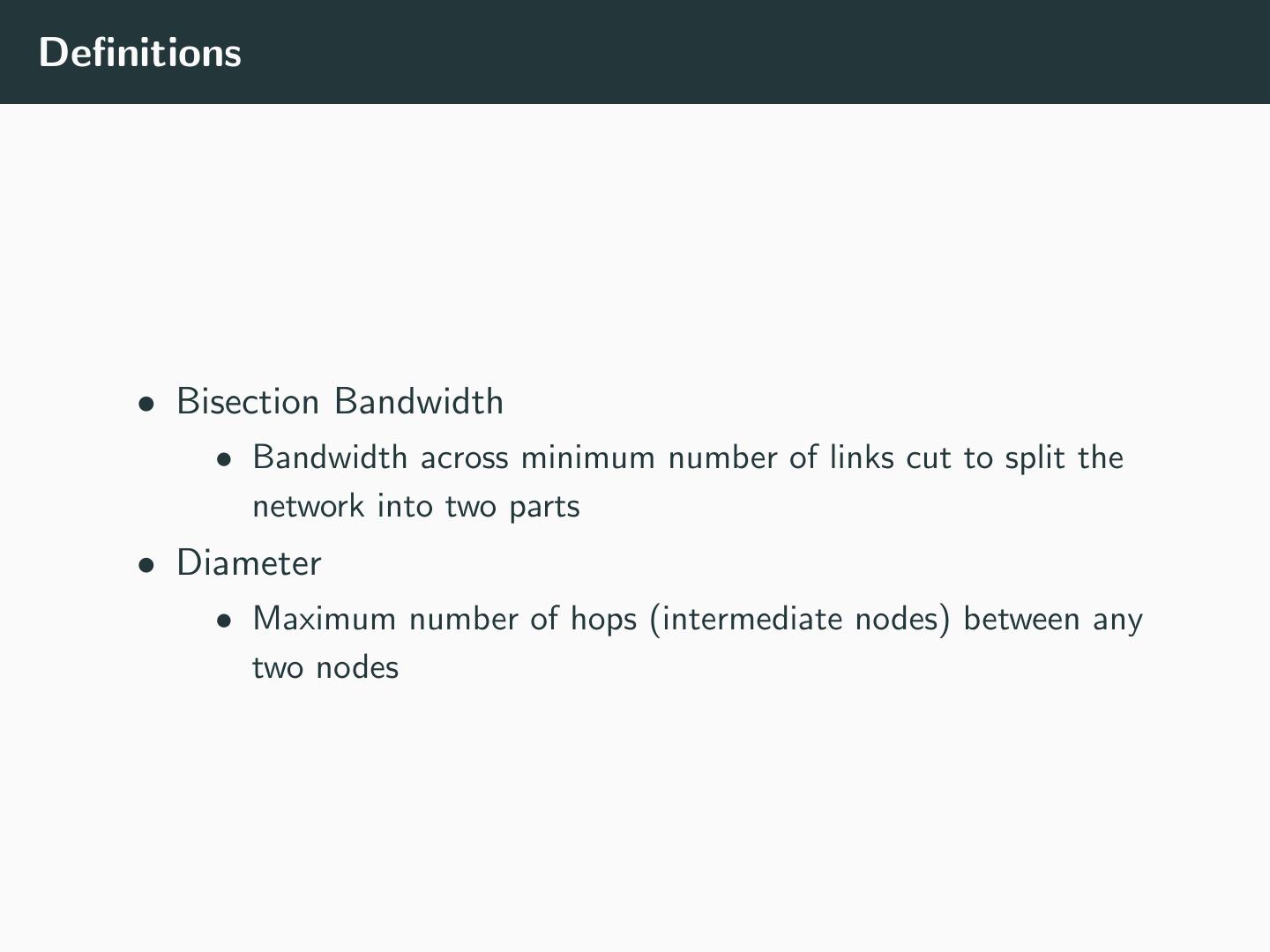 10 .Definitions • Bisection Bandwidth • Bandwidth across minimum number of links cut to split the network into two parts • Diameter • Maximum number of hops (intermediate nodes) between any two nodes