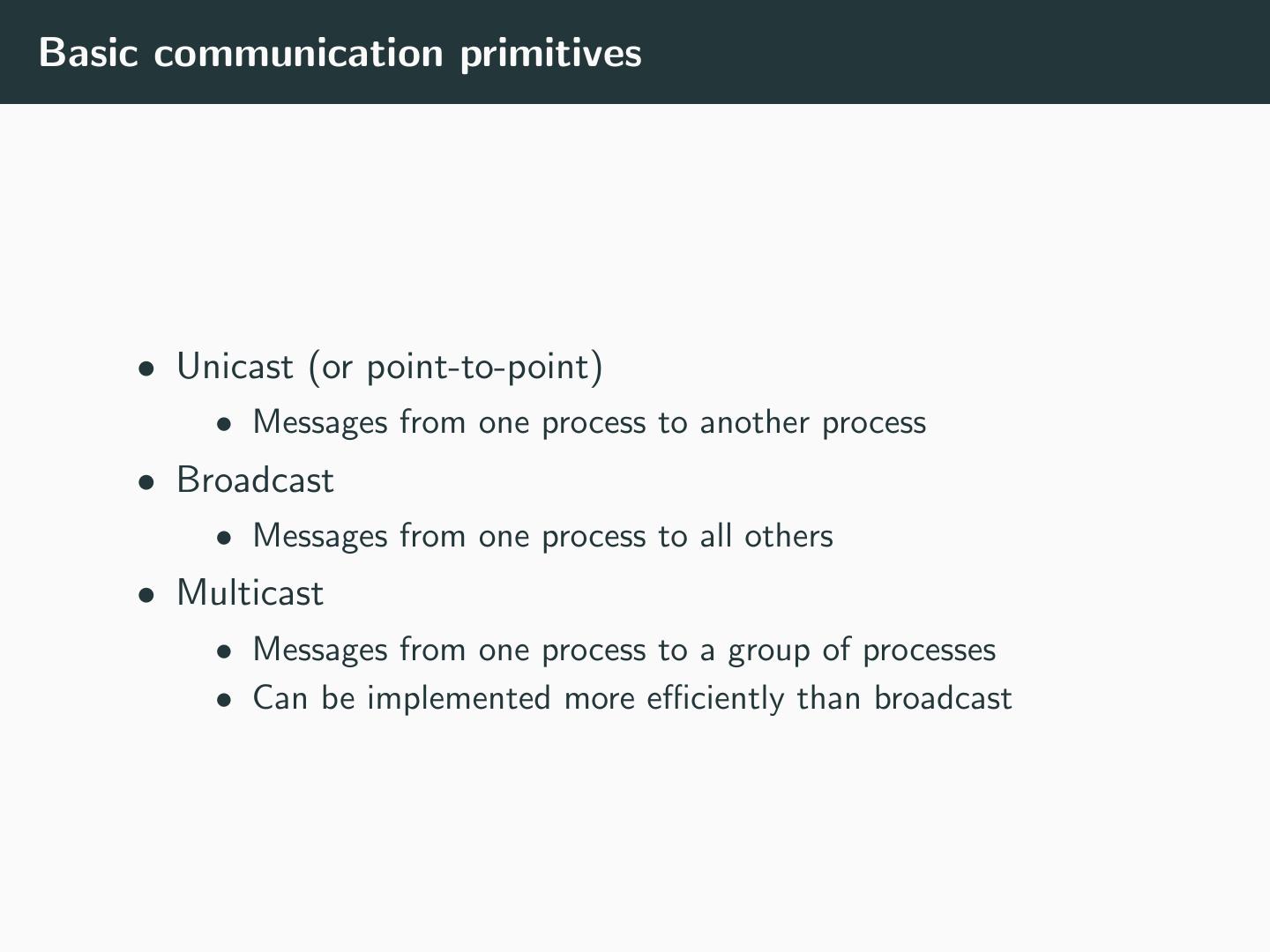 20 .Basic communication primitives • Unicast (or point-to-point) • Messages from one process to another process • Broadcast • Messages from one process to all others • Multicast • Messages from one process to a group of processes • Can be implemented more efficiently than broadcast