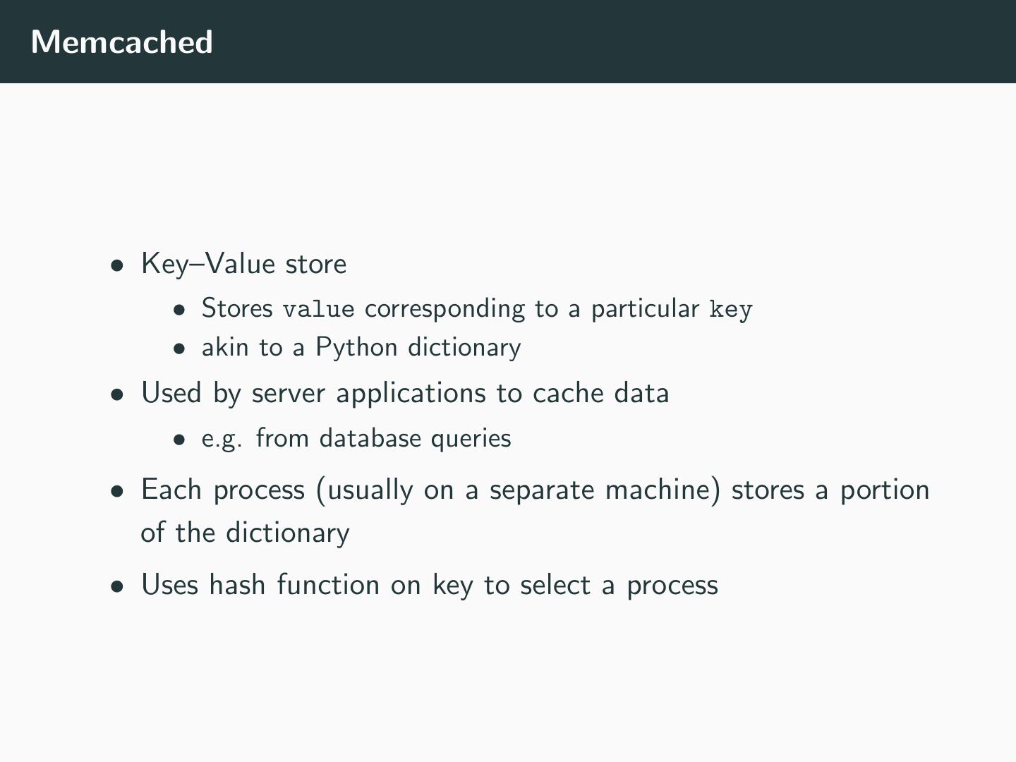 22 .Memcached • Key–Value store • Stores value corresponding to a particular key • akin to a Python dictionary • Used by server applications to cache data • e.g. from database queries • Each process (usually on a separate machine) stores a portion of the dictionary • Uses hash function on key to select a process