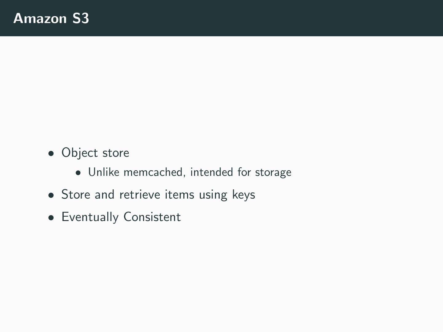 23 .Amazon S3 • Object store • Unlike memcached, intended for storage • Store and retrieve items using keys • Eventually Consistent