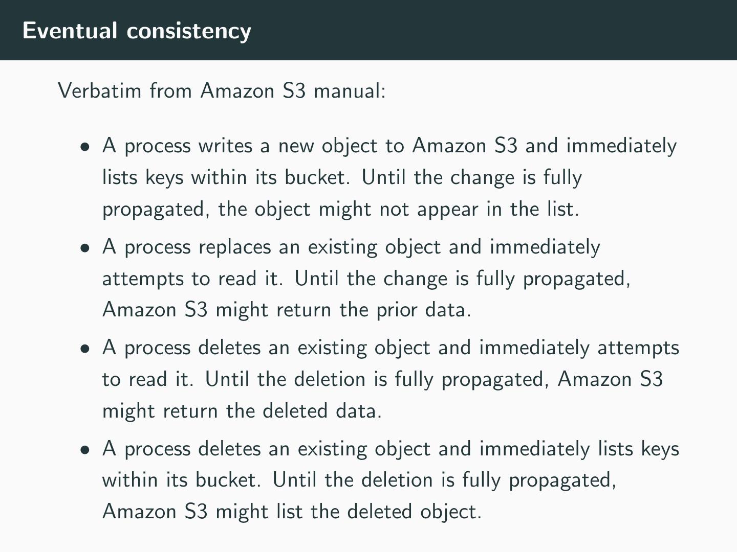 24 .Eventual consistency Verbatim from Amazon S3 manual: • A process writes a new object to Amazon S3 and immediately lists keys within its bucket. Until the change is fully propagated, the object might not appear in the list. • A process replaces an existing object and immediately attempts to read it. Until the change is fully propagated, Amazon S3 might return the prior data. • A process deletes an existing object and immediately attempts to read it. Until the deletion is fully propagated, Amazon S3 might return the deleted data. • A process deletes an existing object and immediately lists keys within its bucket. Until the deletion is fully propagated, Amazon S3 might list the deleted object.