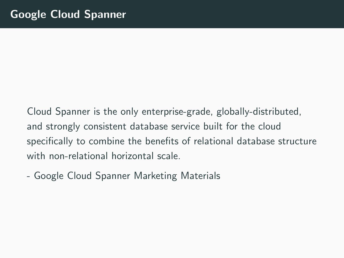 25 .Google Cloud Spanner Cloud Spanner is the only enterprise-grade, globally-distributed, and strongly consistent database service built for the cloud specifically to combine the benefits of relational database structure with non-relational horizontal scale. - Google Cloud Spanner Marketing Materials