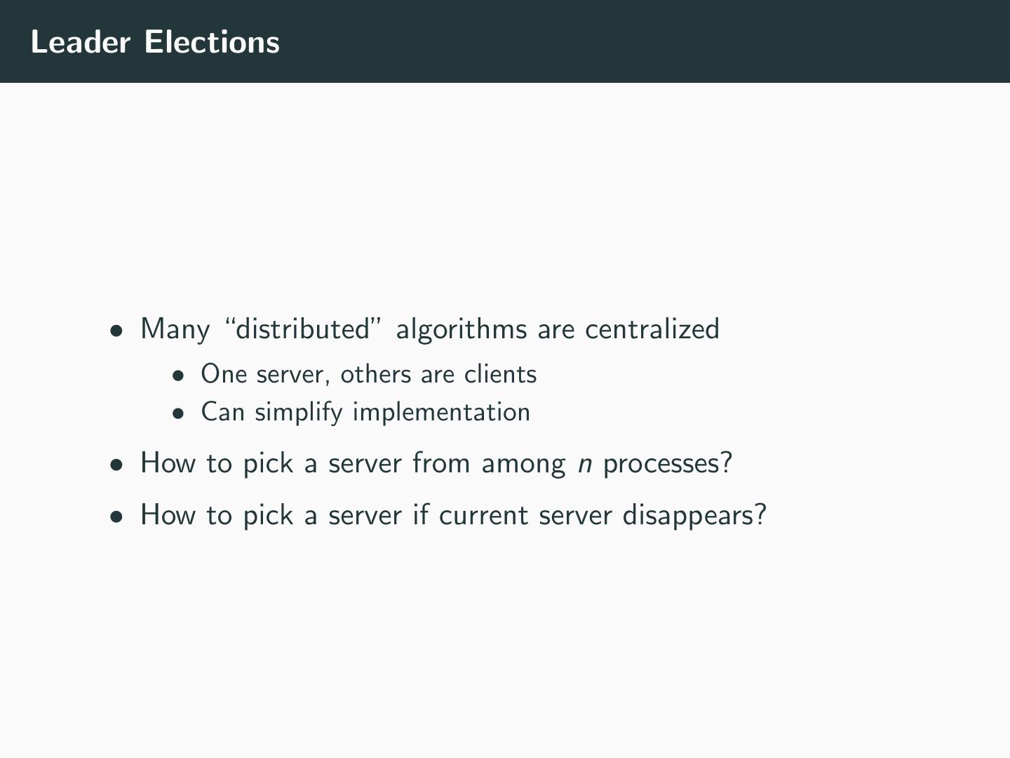 27 .Leader Elections • Many “distributed” algorithms are centralized • One server, others are clients • Can simplify implementation • How to pick a server from among n processes? • How to pick a server if current server disappears?