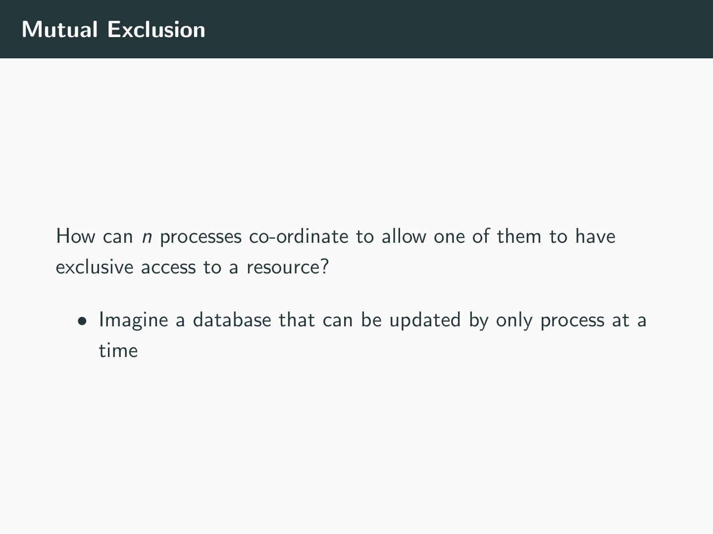 28 .Mutual Exclusion How can n processes co-ordinate to allow one of them to have exclusive access to a resource? • Imagine a database that can be updated by only process at a time