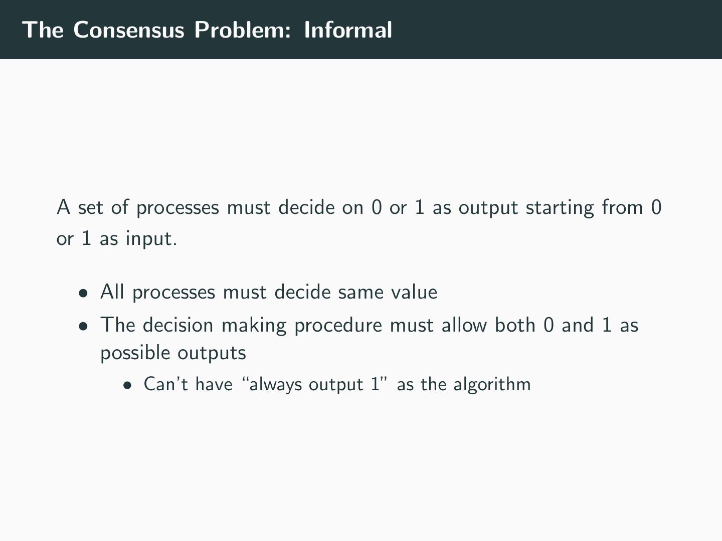 4 .The Consensus Problem: Informal A set of processes must decide on 0 or 1 as output starting from 0 or 1 as input. • All processes must decide same value • The decision making procedure must allow both 0 and 1 as possible outputs • Can’t have “always output 1” as the algorithm