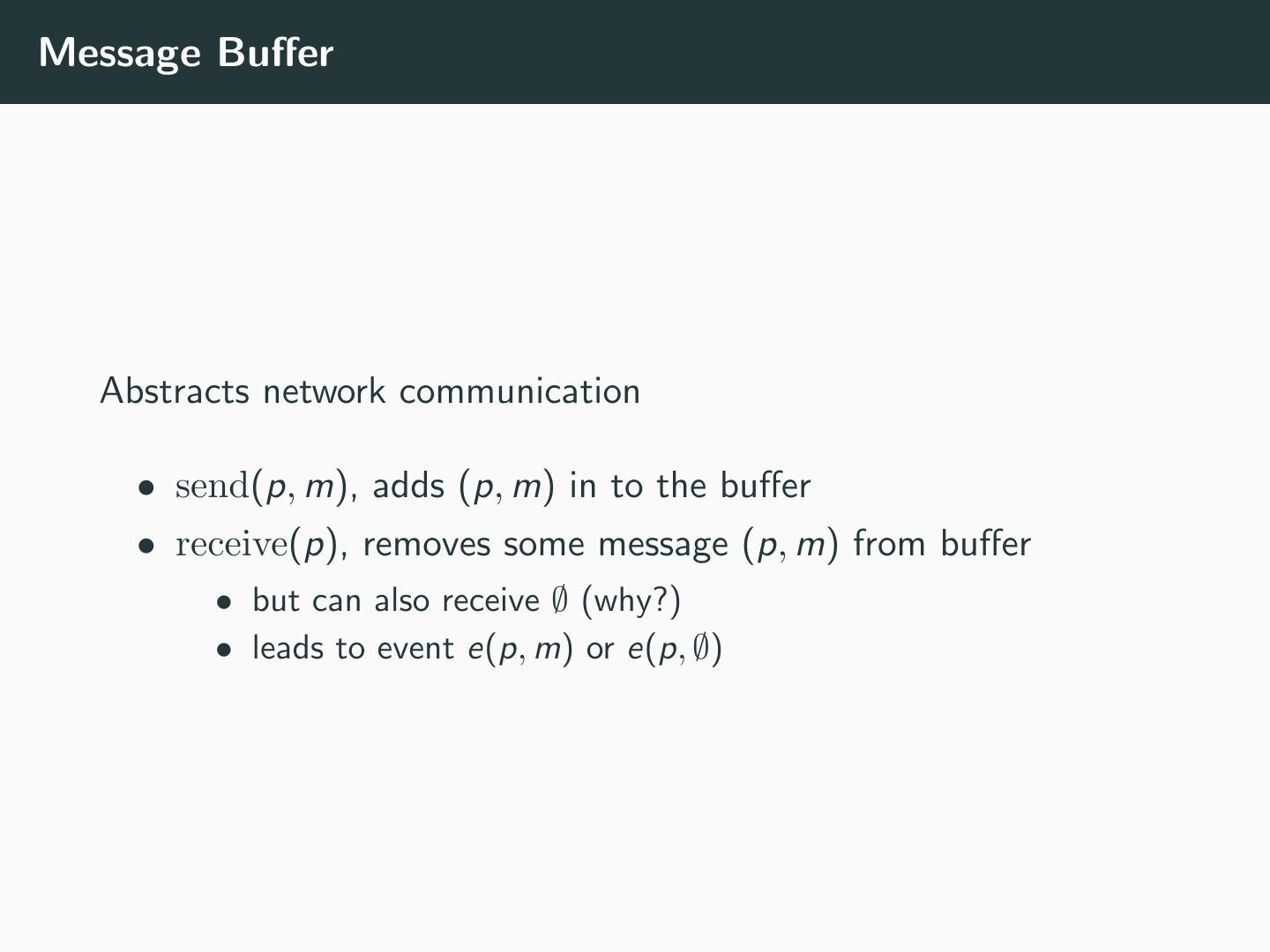 6 .Message Buffer Abstracts network communication • send(p, m), adds (p, m) in to the buffer • receive(p), removes some message (p, m) from buffer • but can also receive ∅ (why?) • leads to event e(p, m) or e(p, ∅)