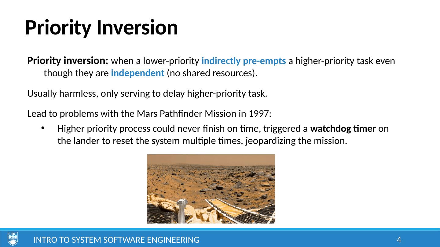 4 .Priority Inversion Priority inversion: when a lower-priority indirectly pre-empts a higher-priority task even though they are independent (no shared resources). Usually harmless, only serving to delay higher-priority task. Lead to problems with the Mars Pathfinder Mission in 1997: Higher priority process could never finish on time, triggered a watchdog timer on the lander to reset the system multiple times, jeopardizing the mission. Intro to System Software Engineering 4