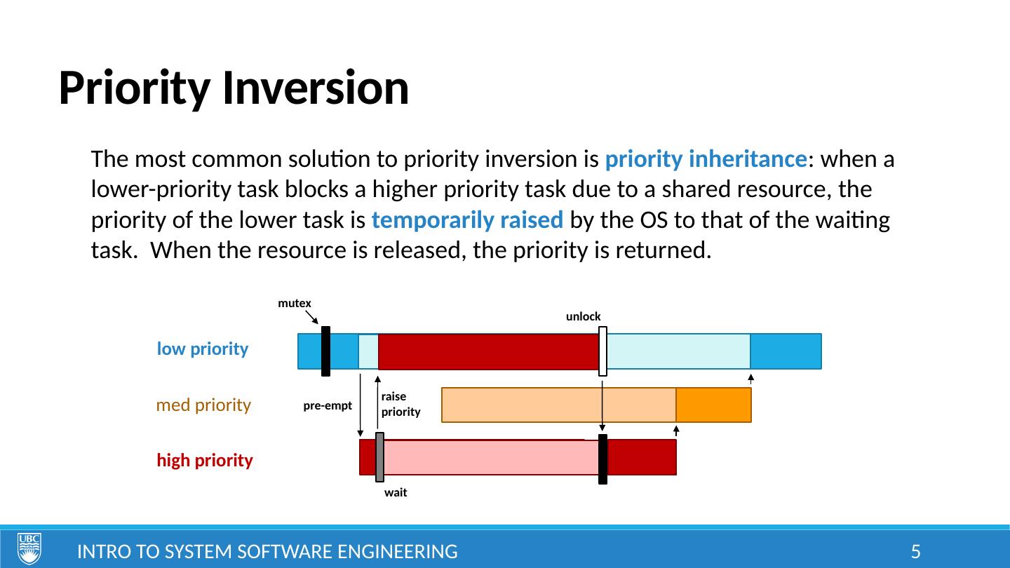 5 .Priority Inversion The most common solution to priority inversion is priority inheritance : when a lower-priority task blocks a higher priority task due to a shared resource, the priority of the lower task is temporarily raised by the OS to that of the waiting task. When the resource is released, the priority is returned. Intro to System Software Engineering 5 mutex pre-empt wait low priority high priority med priority unlock raise priority