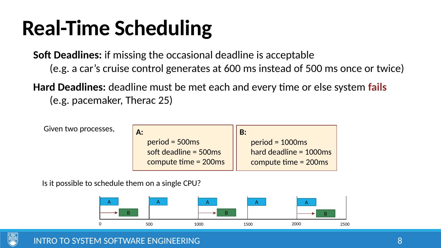 8 .Real-Time Scheduling Soft Deadlines: if missing the occasional deadline is acceptable (e.g. a car’s cruise control generates at 600 ms instead of 500 ms once or twice) Hard Deadlines: deadline must be met each and every time or else system fails (e.g. pacemaker, Therac 25) Intro to System Software Engineering 8 Given two processes, A: period = 500ms soft deadline = 500ms compute time = 200ms B: period = 1000ms hard deadline = 1000ms compute time = 200ms Is it possible to schedule them on a single CPU? B A A A A A B B 0 500 1000 1500 2000 2500