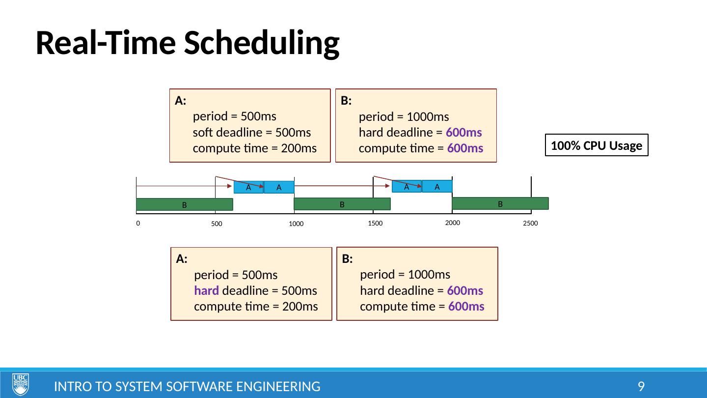 9 .Real-Time Scheduling Intro to System Software Engineering 9 A: period = 500ms soft deadline = 500ms compute time = 200ms B: period = 1000ms hard deadline = 600ms compute time = 600ms B A A B A A B A: period = 500ms hard deadline = 500ms compute time = 200ms B: period = 1000ms hard deadline = 600ms compute time = 600ms 100% CPU Usage 0 500 1000 1500 2000 2500
