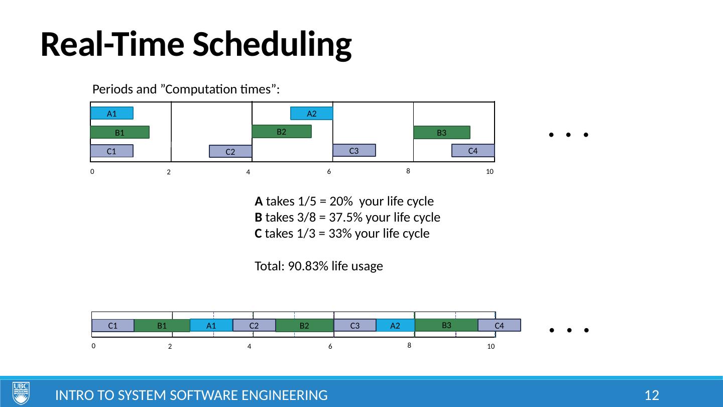 12 .Real-Time Scheduling Intro to System Software Engineering 12 B1 A1 0 2 4 6 8 10 A2 B2 B3 C1 C2 C3 . . . A takes 1/5 = 20% your life cycle B takes 3/8 = 37.5% your life cycle C takes 1/3 = 33% your life cycle Total: 90.83% life usage Periods and ”Computation times”: B1 A1 0 2 4 6 8 10 A2 B2 B3 C1 C2 C3 . . . C4 C4