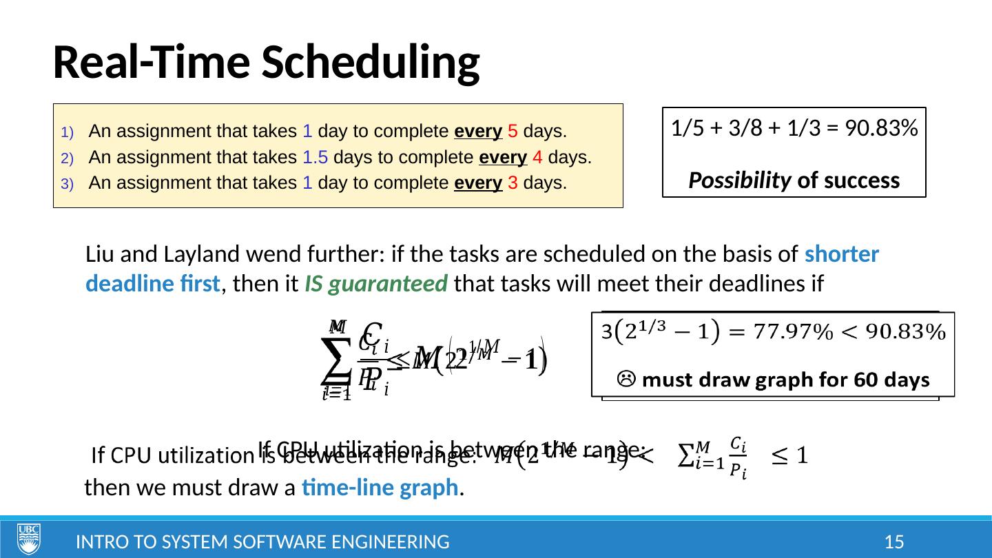 15 .Real-Time Scheduling Intro to System Software Engineering 15 An assignment that takes 1 day to complete every 5 days. An assignment that takes 1.5 days to complete every 4 days. An assignment that takes 1 day to complete every 3 days. 1/5 + 3/8 + 1/3 = 90.83% Possibility of success Liu and Layland wend further: if the tasks are scheduled on the basis of shorter deadline first , then it IS guaranteed that tasks will meet their deadlines if If CPU utilization is between the range: 3 must draw graph for 60 days then we must draw a time-line graph .