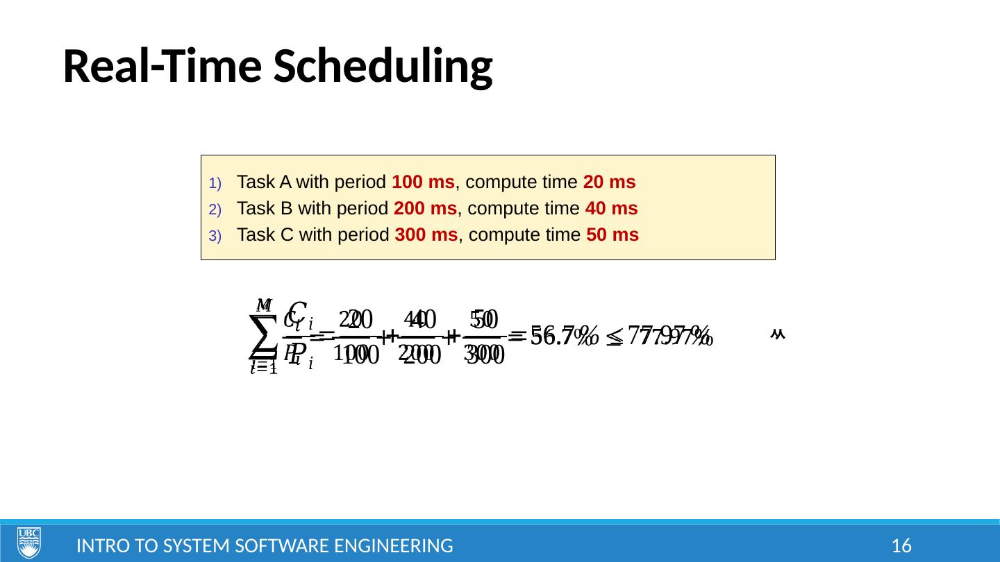 16 .Real-Time Scheduling Intro to System Software Engineering 16 Task A with period 100 ms , compute time 20 ms Task B with period 200 ms , compute time 40 ms Task C with period 300 ms , compute time 50 ms