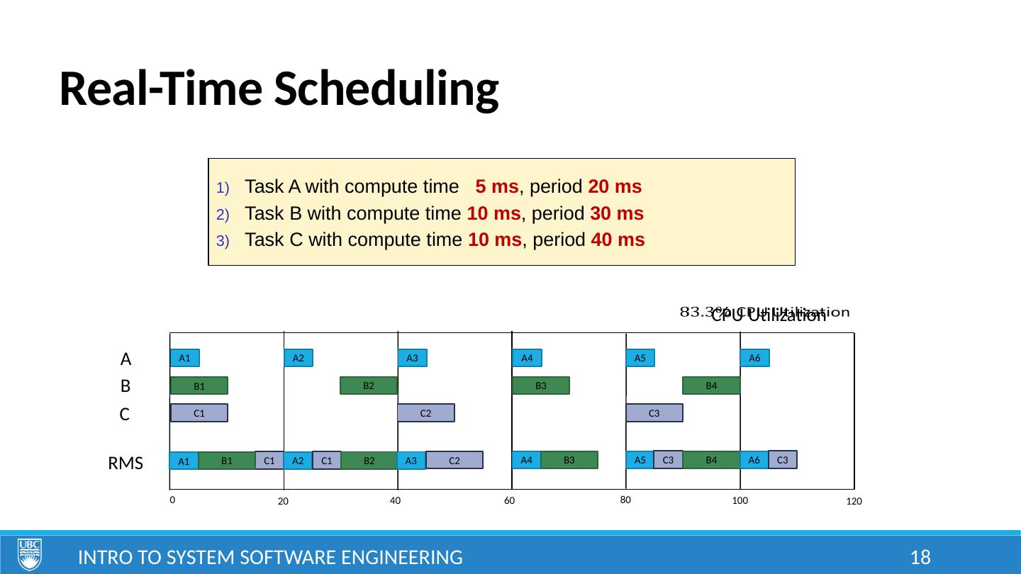 18 .Real-Time Scheduling Intro to System Software Engineering 18 B1 A1 0 20 40 60 80 100 C1 Task A with compute time 5 ms , period 20 ms Task B with compute time 10 ms , period 30 ms Task C with compute time 10 ms , period 40 ms 120 A2 A3 A4 A5 A6 B2 B3 B4 C2 C3 A1 B1 A2 C1 B2 A3 C2 A4 B3 A5 C3 B4 A6 C3 C1 RMS A B C CPU Utilization