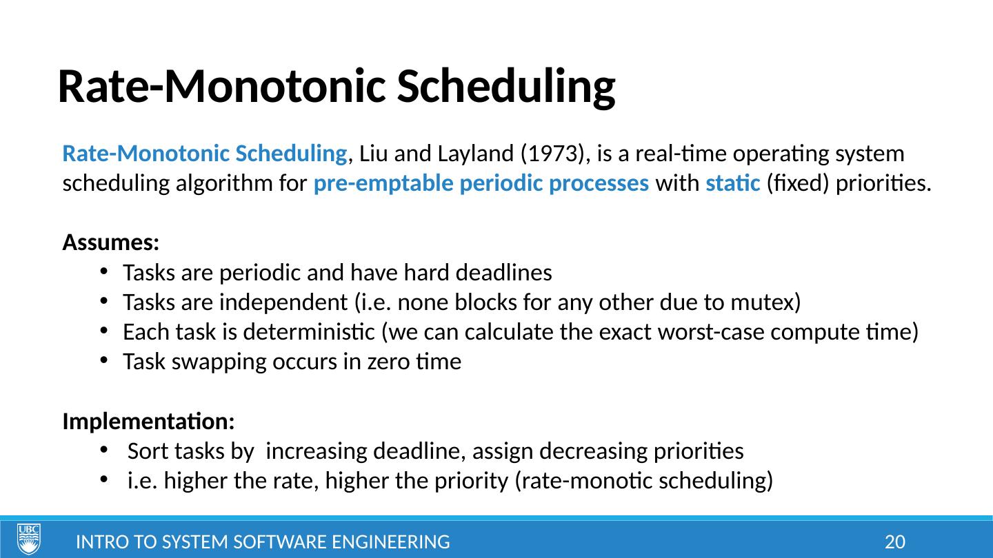 20 .Rate-Monotonic Scheduling Intro to System Software Engineering 20 Rate-Monotonic Scheduling , Liu and Layland (1973), is a real-time operating system scheduling algorithm for pre-emptable periodic processes with static (fixed) priorities. Assumes: Tasks are periodic and have hard deadlines Tasks are independent (i.e. none blocks for any other due to mutex) Each task is deterministic (we can calculate the exact worst-case compute time) Task swapping occurs in zero time Implementation: Sort tasks by increasing deadline, assign decreasing priorities i.e. higher the rate, higher the priority (rate-monotic scheduling)