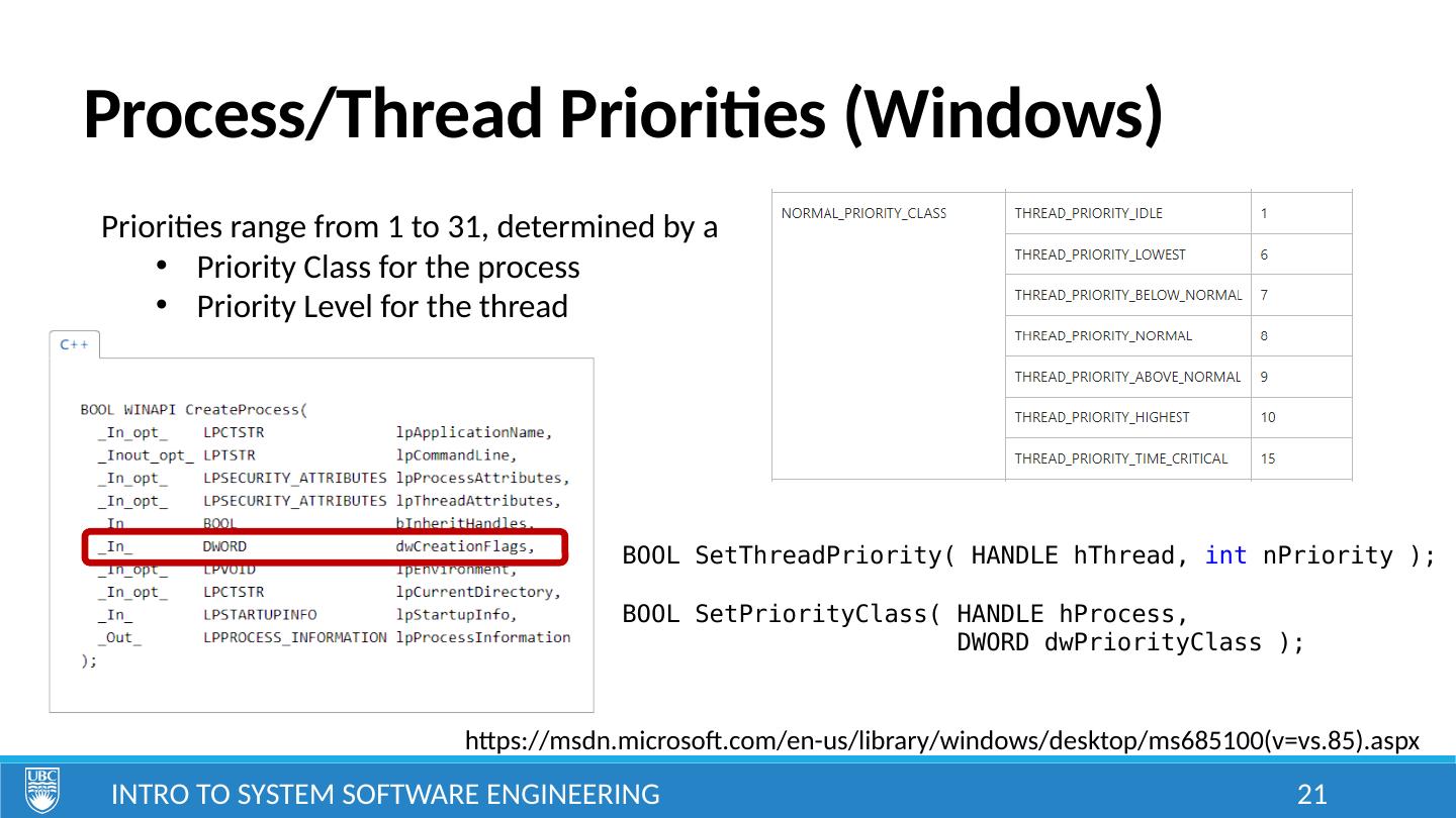 21 .Process/Thread Priorities (Windows) Intro to System Software Engineering 21 Priorities range from 1 to 31, determined by a Priority Class for the process Priority Level for the thread https://msdn.microsoft.com/en-us/library/windows/desktop/ms685100(v=vs.85).aspx BOOL SetThreadPriority( HANDLE hThread, int nPriority ); BOOL SetPriorityClass( HANDLE hProcess, DWORD dwPriorityClass );