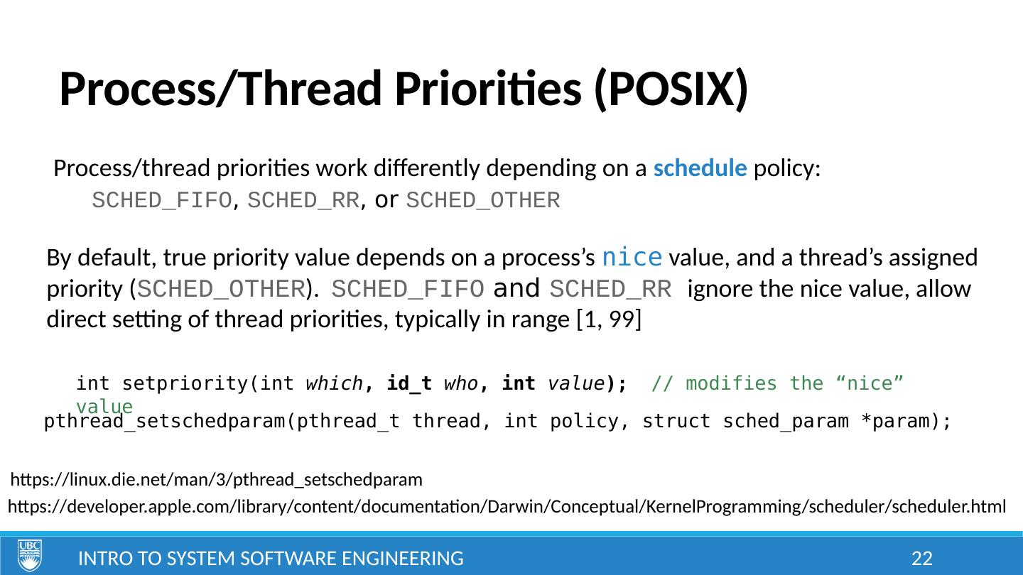 22 .Process/Thread Priorities (POSIX) Intro to System Software Engineering 22 https://developer.apple.com/library/content/documentation/Darwin/Conceptual/KernelProgramming/scheduler/scheduler.html Process/thread priorities work differently depending on a schedule policy: SCHED_FIFO , SCHED_RR , or SCHED_OTHER By default, true priority value depends on a process’s nice value, and a thread’s assigned priority ( SCHED_OTHER ) . SCHED_FIFO and SCHED_RR ignore the nice value, allow direct setting of thread priorities, typically in range [1, 99] pthread_setschedparam(pthread_t thread, int policy, struct sched_param *param); int setpriority(int which , id_t who , int value ); // modifies the “nice” value https://linux.die.net/man/3/pthread_setschedparam