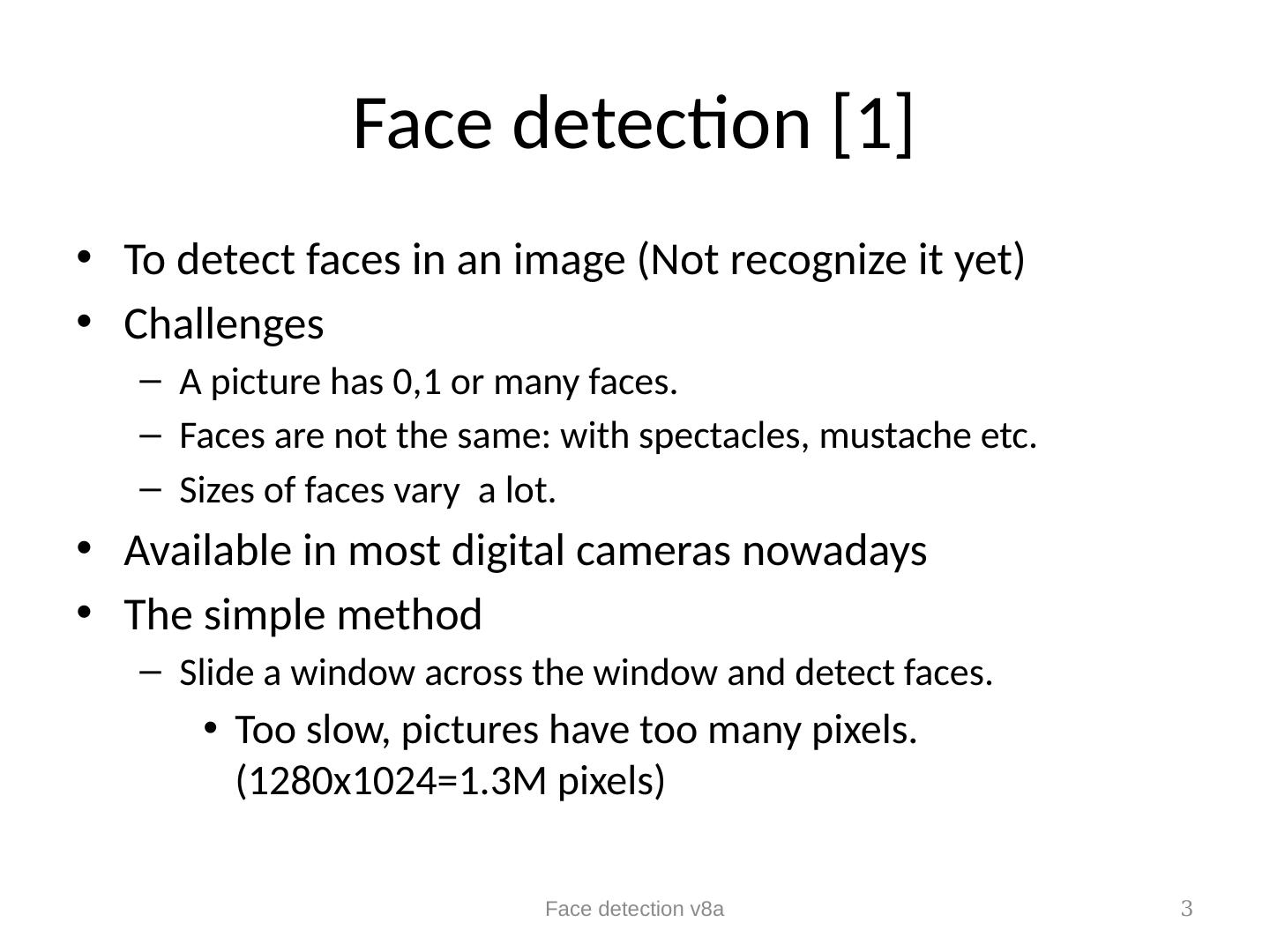 3 .Face detection [1] To detect faces in an image (Not recognize it yet) Challenges A picture has 0,1 or many faces. Faces are not the same: with spectacles, mustache etc. Sizes of faces vary a lot. Available in most digital cameras nowadays The simple method Slide a window across the window and detect faces. Too slow, pictures have too many pixels. (1280x1024=1.3M pixels) Face detection v8a 3