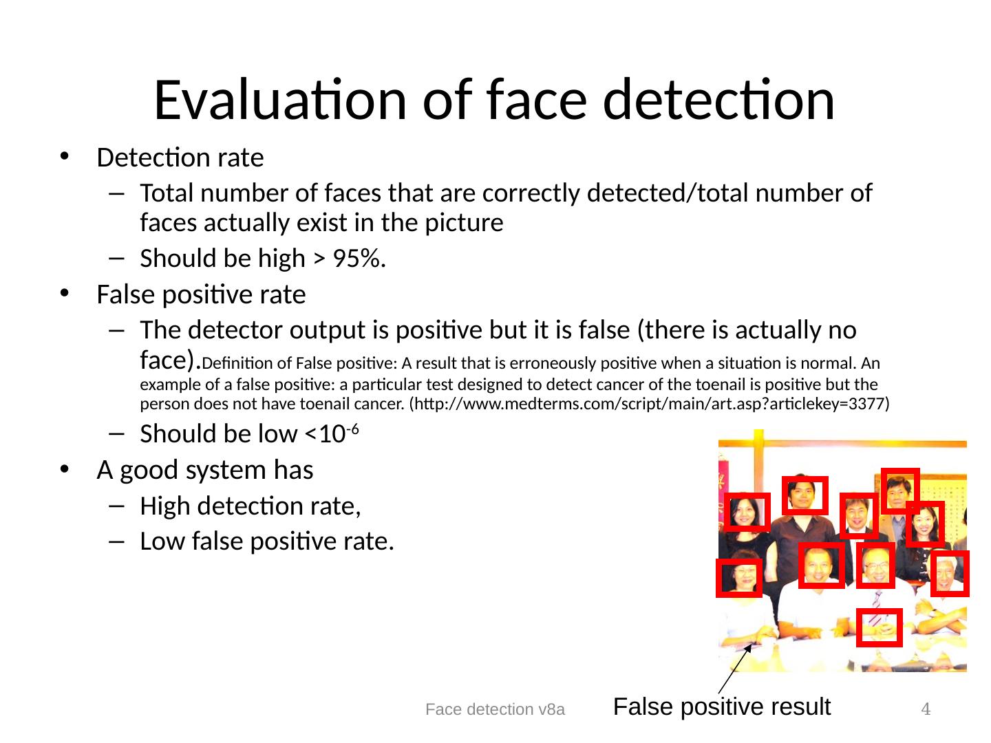 5 .Example What are the detection rate and false positive rate here? Answer detection rate=(6/9)*100% false positive rate=(1/7)*100% Face detection v8a 5 False positive result 6 faces correctly detected in the picture, 9 actually faces exist in the image 7 windows reported to have faces , but in 1 window it is not a face