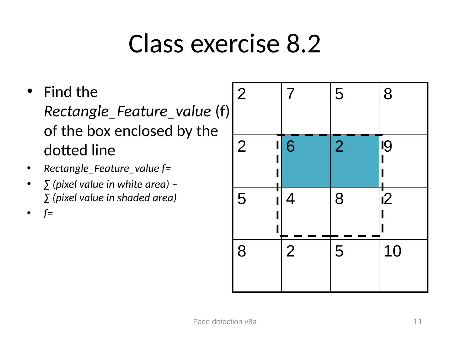 11 .Class exercise 8.2 Find the Rectangle_Feature_value (f) of the box enclosed by the dotted line Rectangle_Feature_value f= ∑ (pixel value in white area) – ∑ (pixel value in shaded area) f= 2 7 5 8 2 6 2 9 5 4 8 2 8 2 5 10 Face detection v8a 11