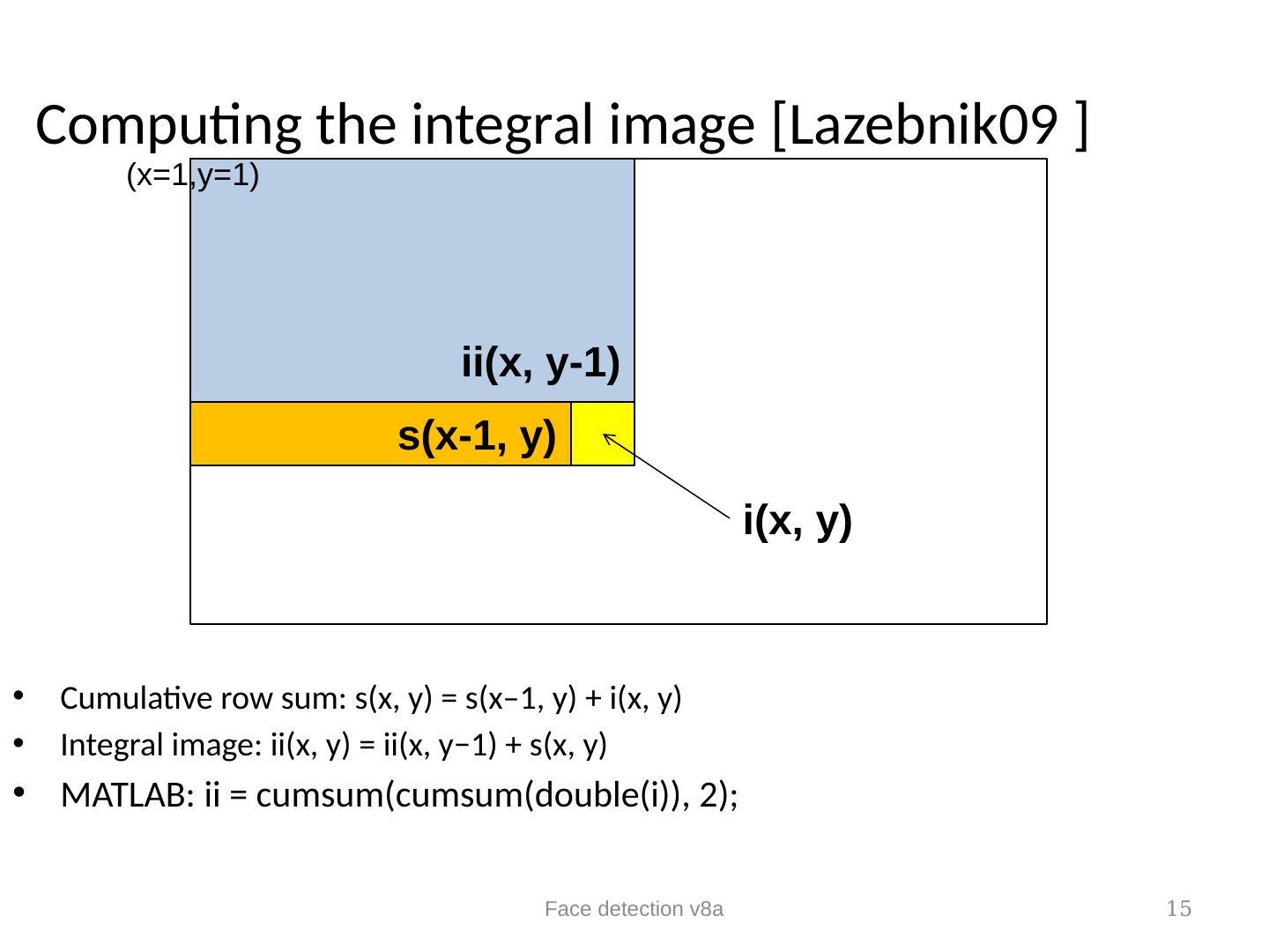 15 .Face detection v8a 15 Computing the integral image [Lazebnik09 ] Cumulative row sum: s(x, y) = s(x–1, y) + i(x, y) Integral image: ii(x, y) = ii(x, y−1) + s(x, y) MATLAB: ii = cumsum(cumsum(double(i)), 2); ii(x, y-1) s(x-1, y) i(x, y) (x=1,y=1)