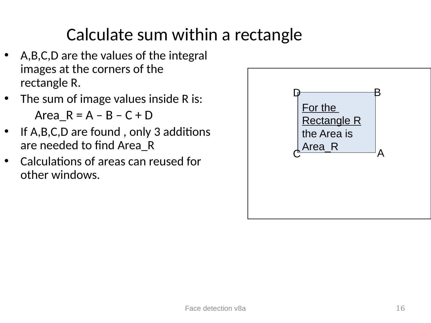 16 .Face detection v8a 16 Calculate sum within a rectangle A,B,C,D are the values of the integral images at the corners of the rectangle R. The sum of image values inside R is: Area_R = A – B – C + D If A,B,C,D are found , only 3 additions are needed to find Area_R Calculations of areas can reused for other windows. D C A B For the Rectangle R the Area is Area_R