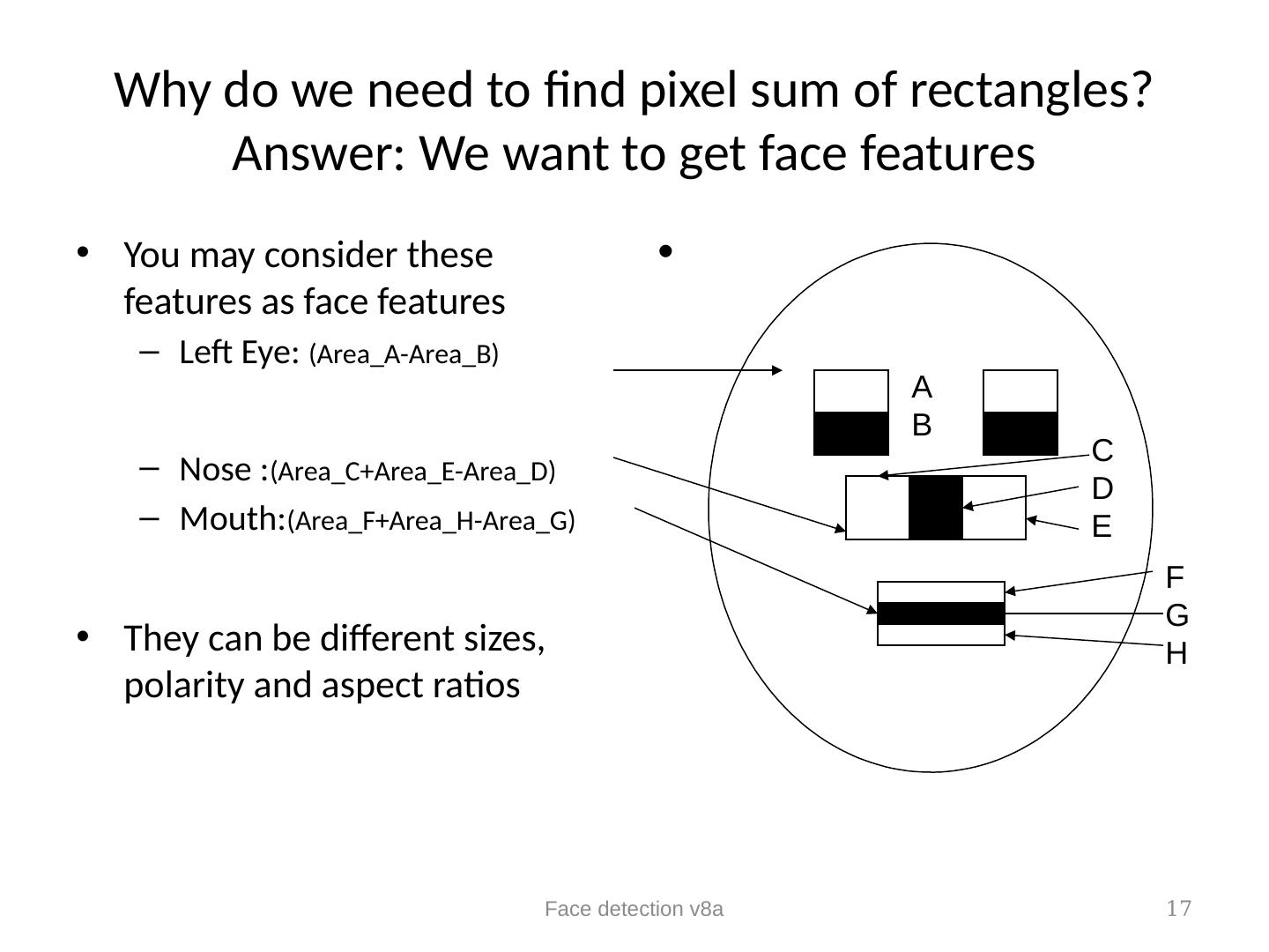 17 .Why do we need to find pixel sum of rectangles? Answer: We want to get face features You may consider these features as face features Left Eye: (Area_A-Area_B) Nose : (Area_C+Area_E-Area_D) Mouth: (Area_F+Area_H-Area_G) They can be different sizes, polarity and aspect ratios Face detection v8a 17 A B C D E F G H