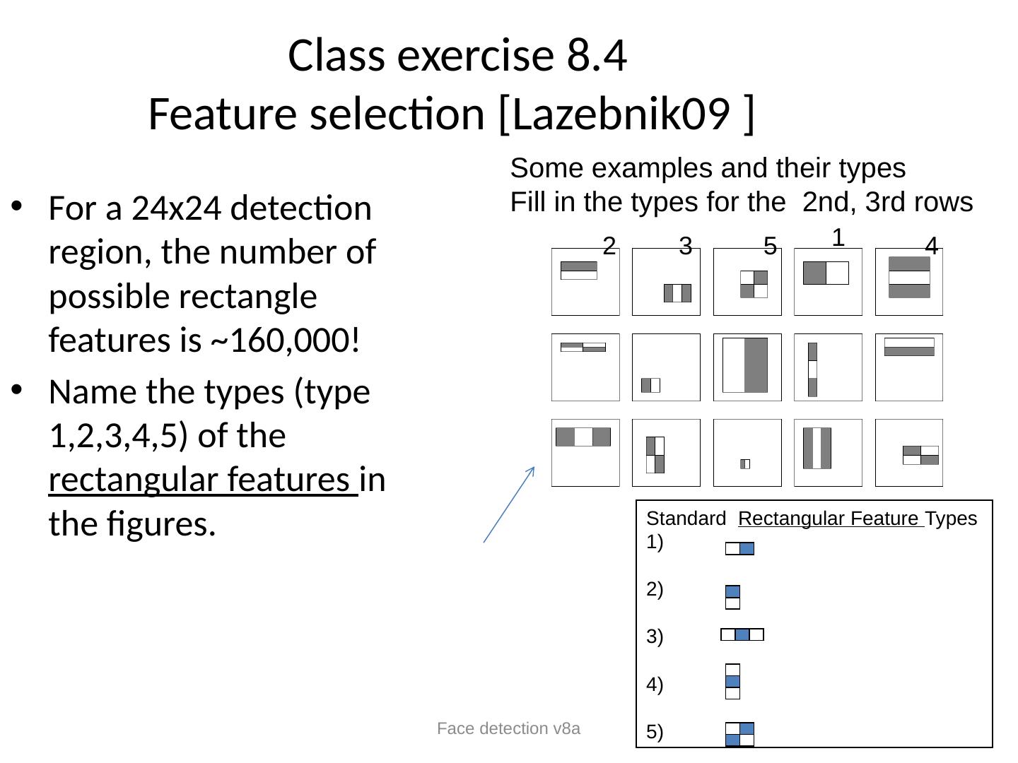 23 .Face detection v8a 23 Class exercise 8.4 Feature selection [Lazebnik09 ] For a 24x24 detection region, the number of possible rectangle features is ~160,000! Name the types (type 1,2,3,4,5) of the rectangular features in the figures. Some examples and their types Fill in the types for the 2nd, 3rd rows 2 5 1 4 3 Standard Rectangular Feature Types 1) 2) 3) 4) 5)