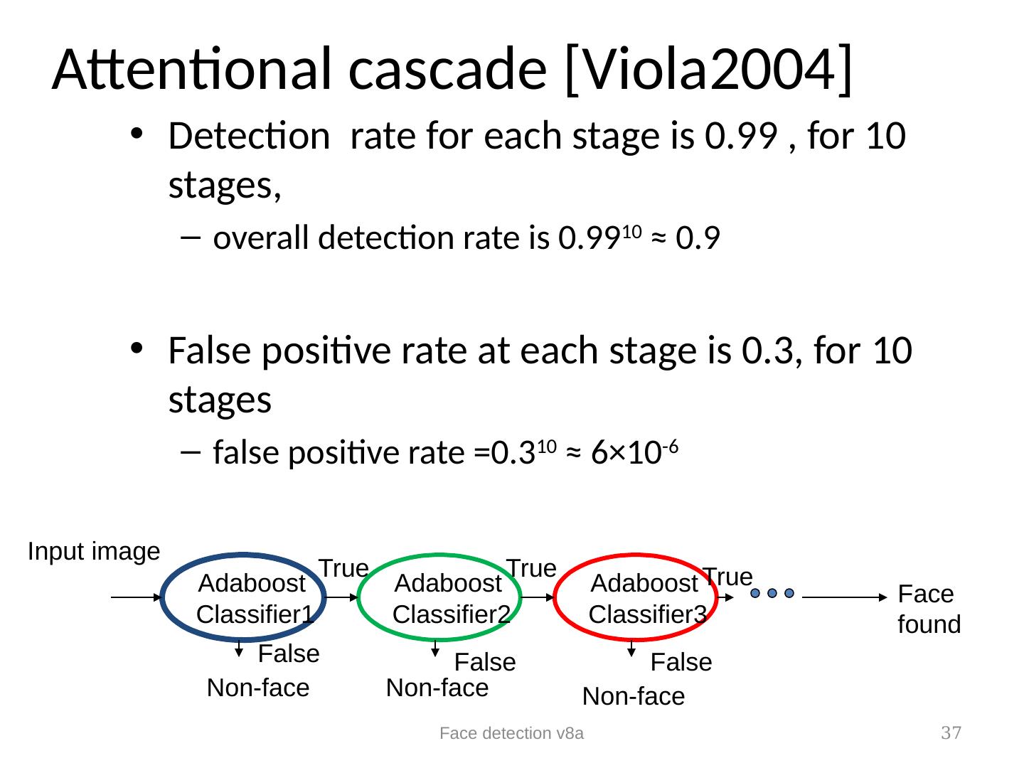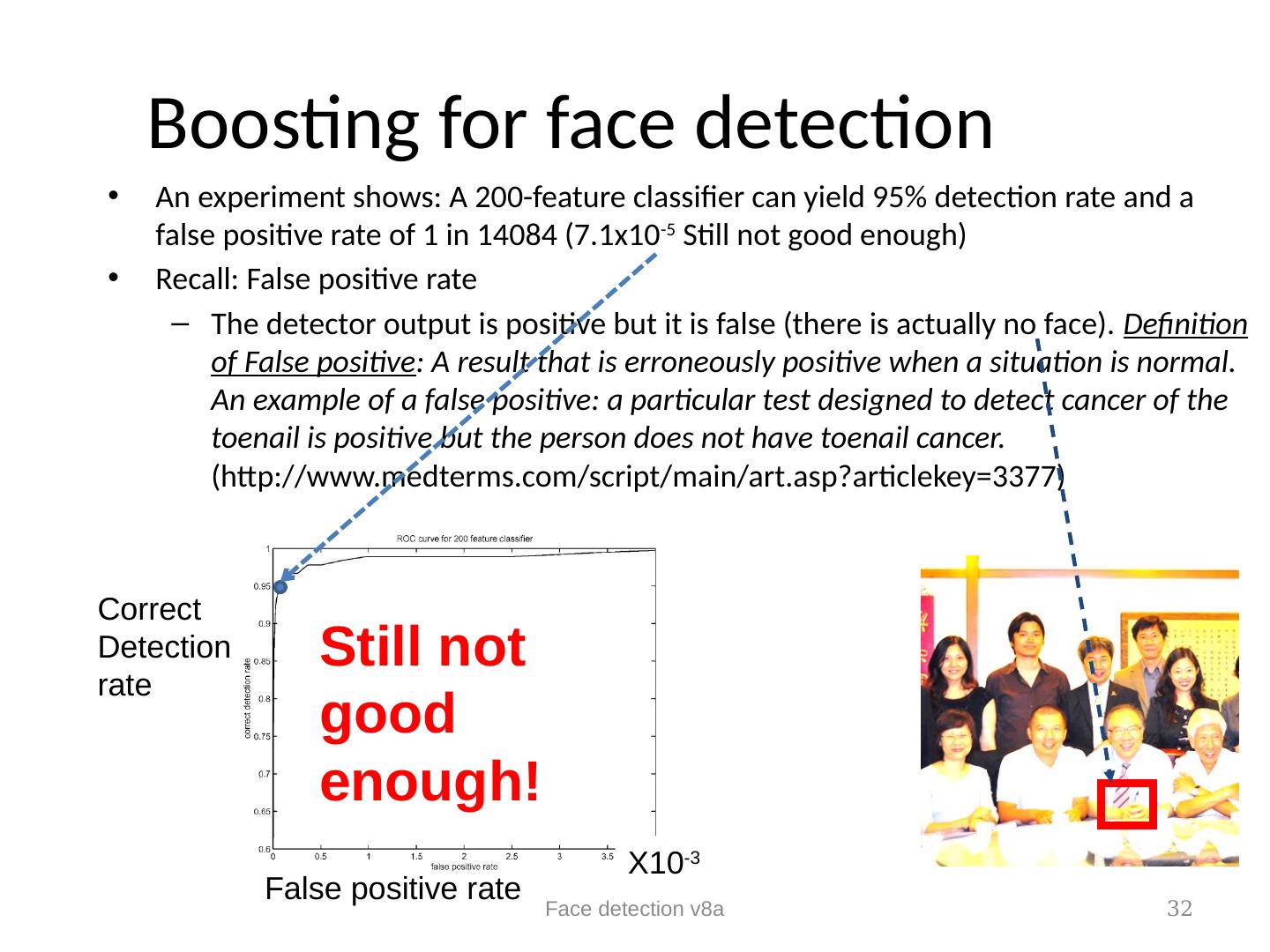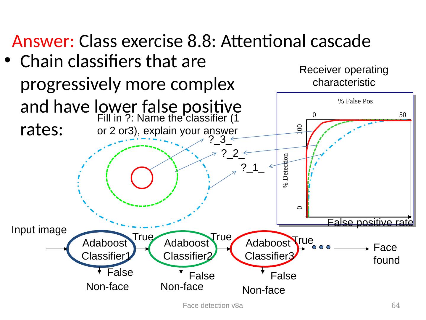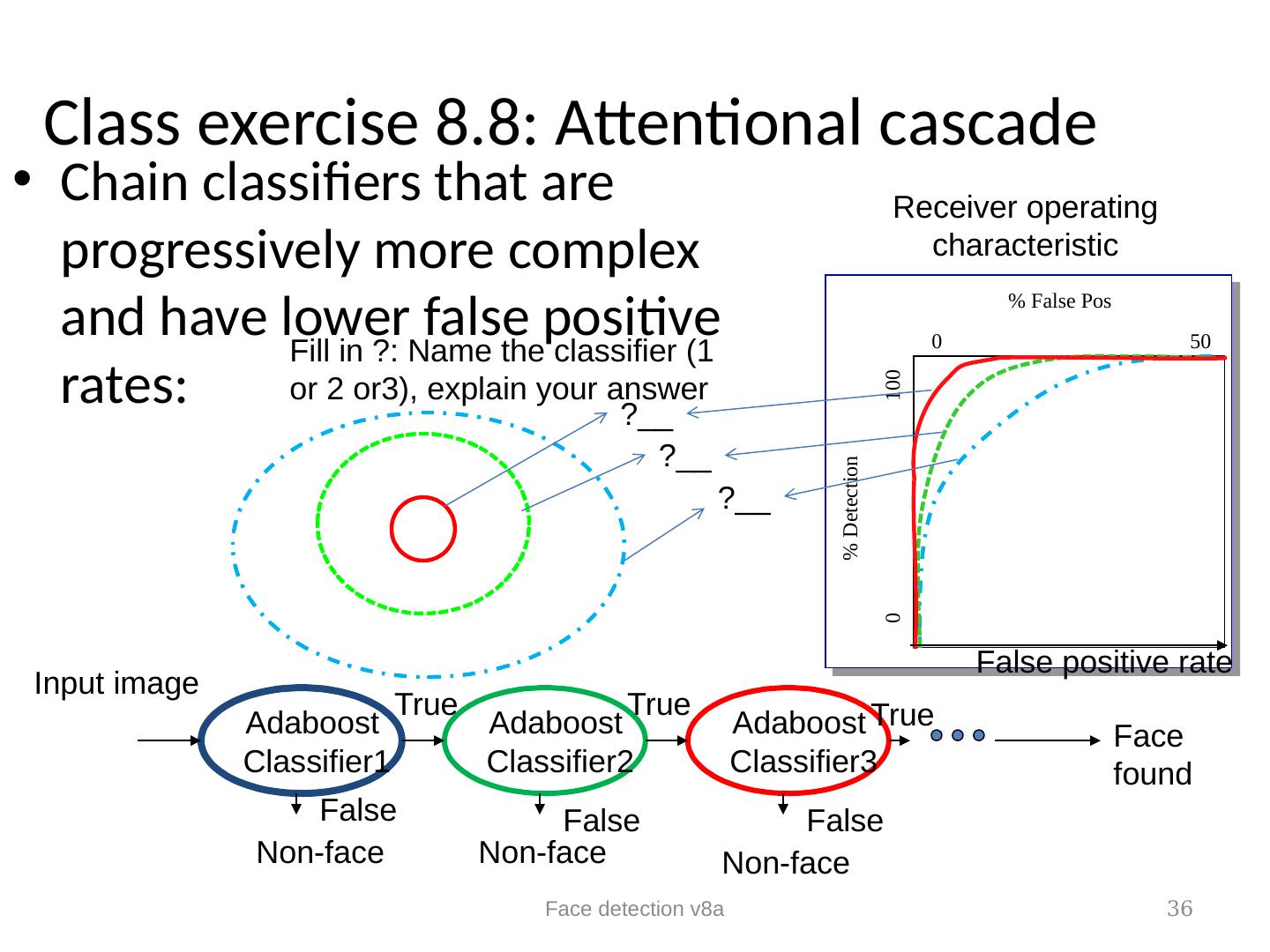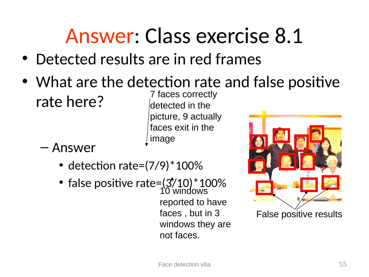 7 .Class exercise 8.1 Detected results are in red frames What are the detection rate and false positive rate here? Answer detection rate=? false positive rate=? Face detection v8a 7