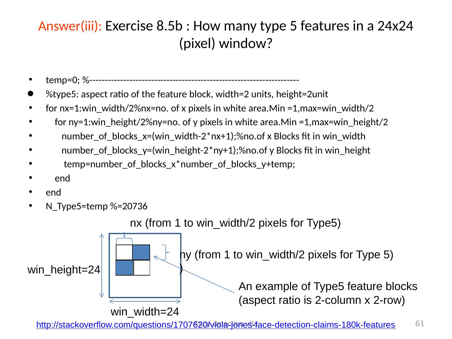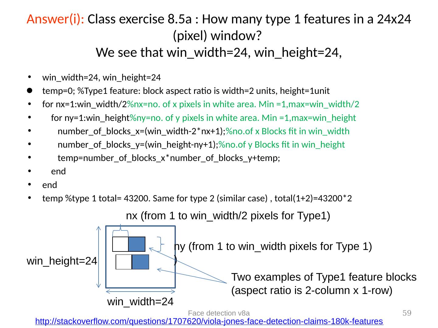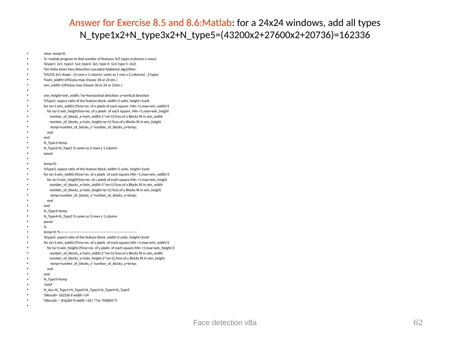 24 .Class exercise 8.5: Features in a 24x24 (pixel) window Exercise 8.5a : How many rectangular features of all-5-types can be found a 24x24 pixel window? Answer: 162,336 (explain) Exercise 8.5b : How many type 1 features are in a 24x24 (pixel) window? Answer:_43200 (explain) Face detection v8a 24 http://stackoverflow.com/questions/1707620/viola-jones-face-detection-claims-180k-features