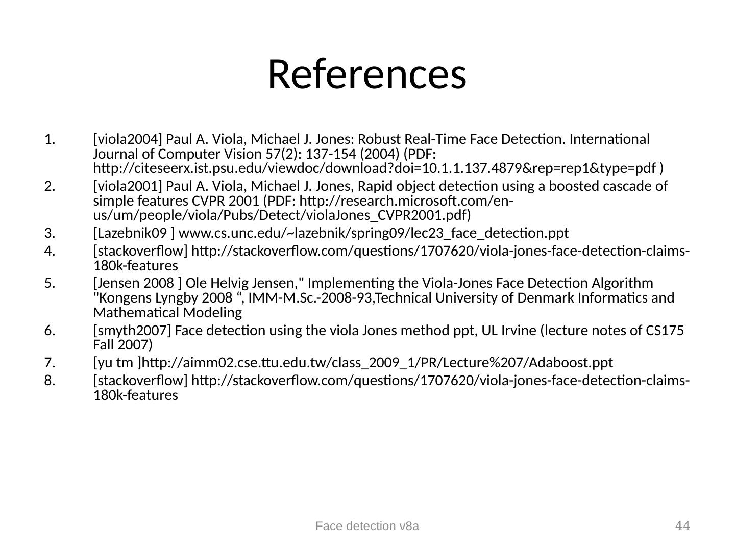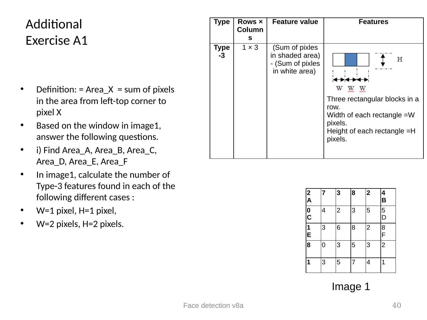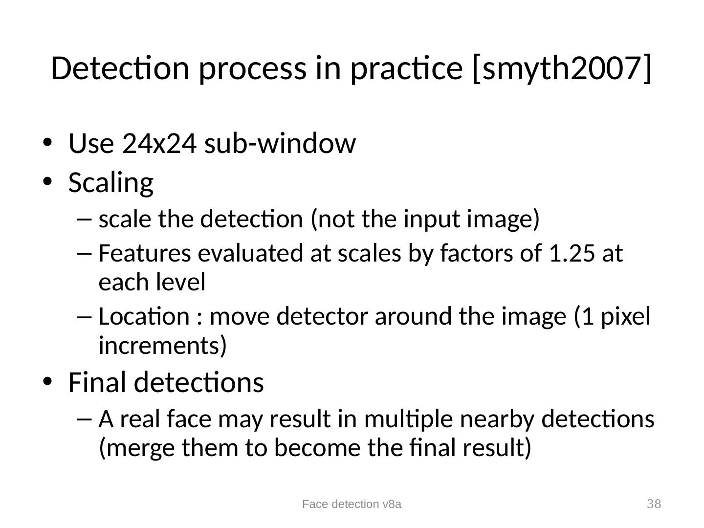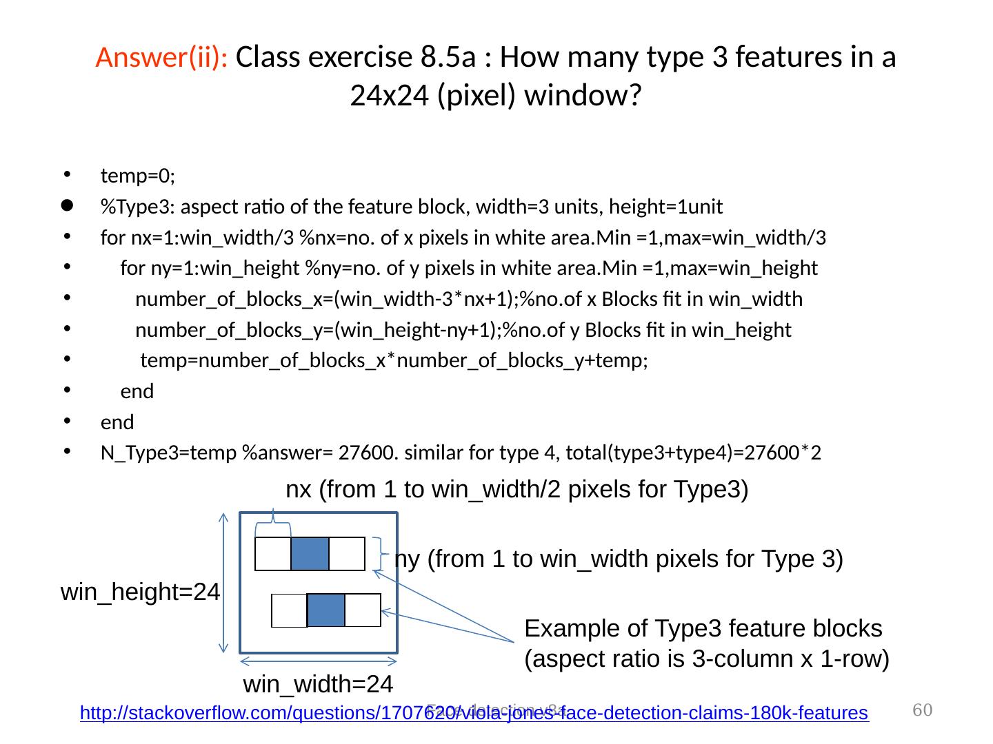 24 .Class exercise 8.5: Features in a 24x24 (pixel) window Exercise 8.5a : How many rectangular features of all-5-types can be found a 24x24 pixel window? Answer: 162,336 (explain) Exercise 8.5b : How many type 1 features are in a 24x24 (pixel) window? Answer:_43200 (explain) Face detection v8a 24 http://stackoverflow.com/questions/1707620/viola-jones-face-detection-claims-180k-features