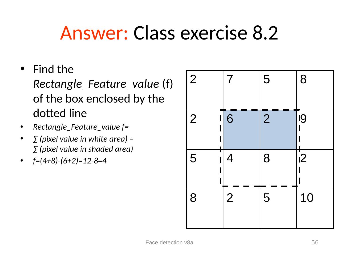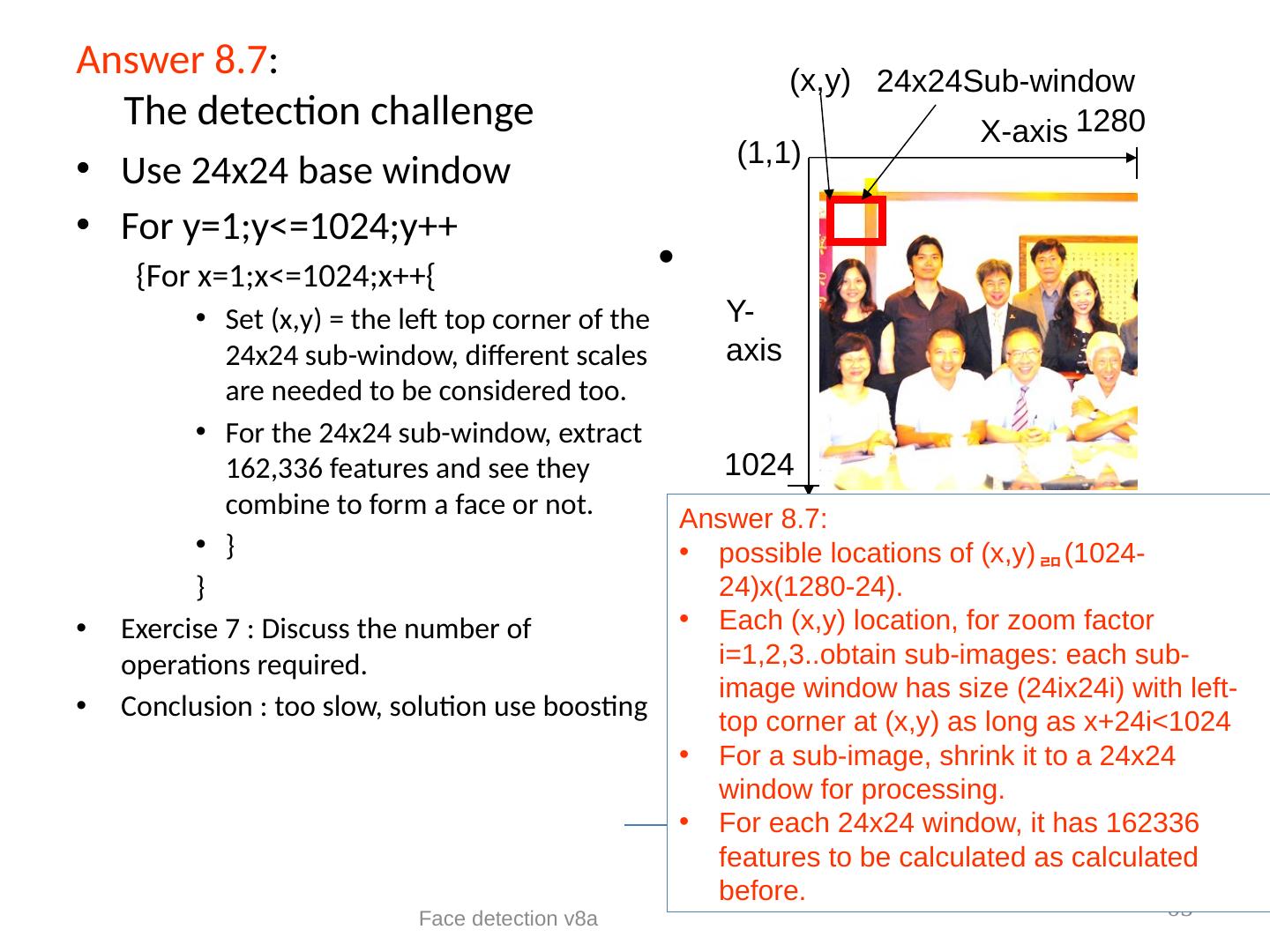 27 .Class exercise 8.7: The detection challenge Use 24x24 base window For y=1;y<=1024;y++ {For x=1;x<=1024;x++{ Set (x,y) = the left top corner of the 24x24 sub-window, different scales are needed to be considered too. For the 24x24 sub-window, extract 162,336 features and see they combine to form a face or not.} } Exercise 7 : Discuss the number of operations required. Conclusion : too slow, solution use boosting Face detection v8a 27 X-axis Y-axis (x,y) 24x24Sub-window 1024 (1,1) 1280 Answer 7: