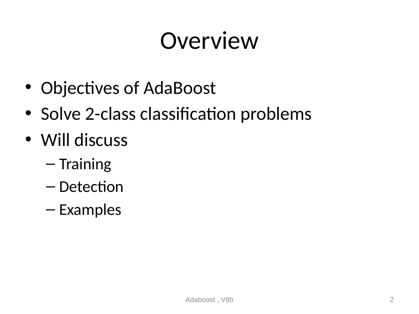 2 .Overview Objectives of AdaBoost Solve 2-class classification problems Will discuss Training Detection Examples Adaboost , V8b 2
