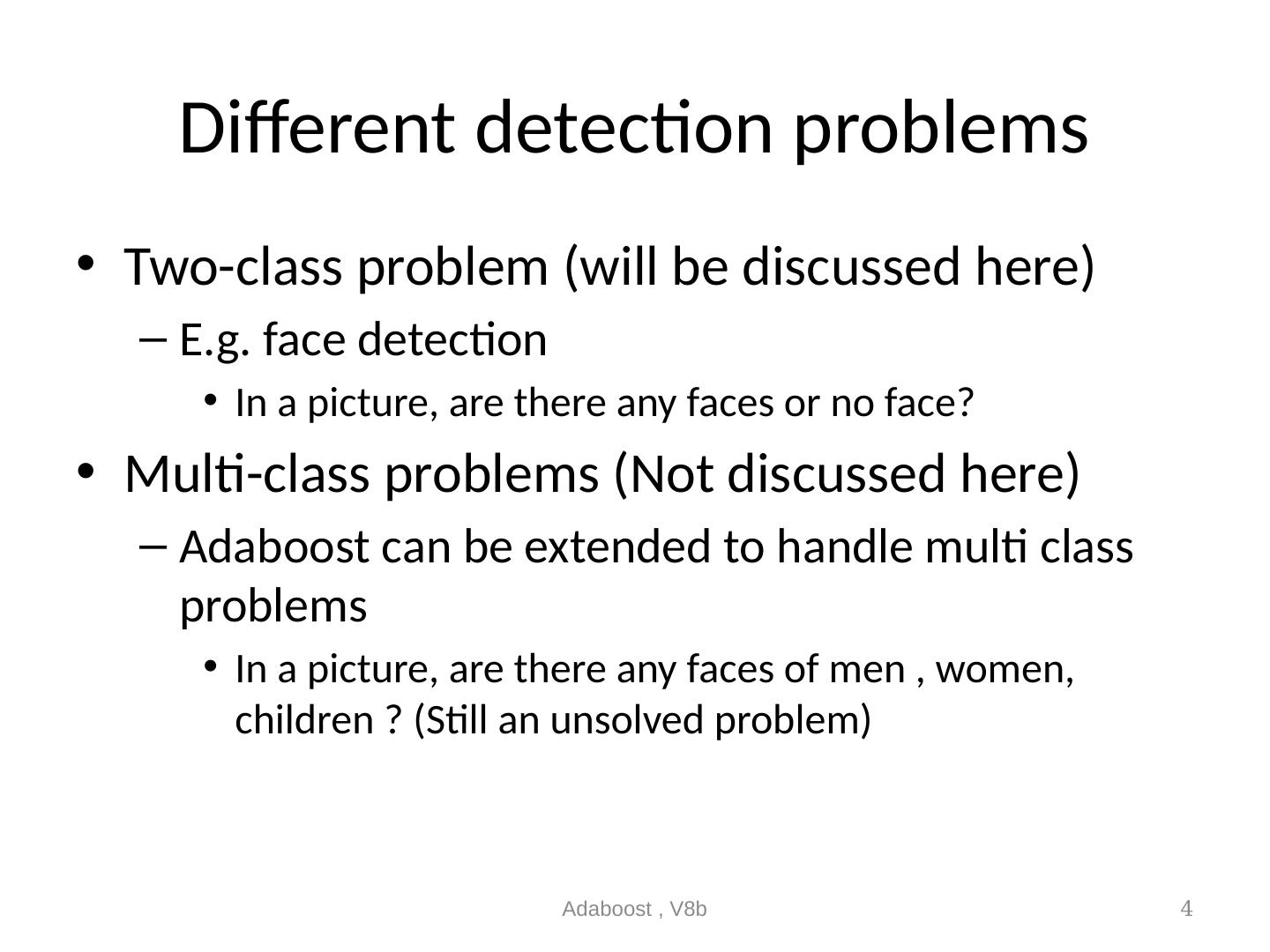 4 .Different detection problems Two-class problem (will be discussed here) E.g. face detection In a picture, are there any faces or no face? Multi-class problems (Not discussed here) Adaboost can be extended to handle multi class problems In a picture, are there any faces of men , women, children ? (Still an unsolved problem) Adaboost , V8b 4