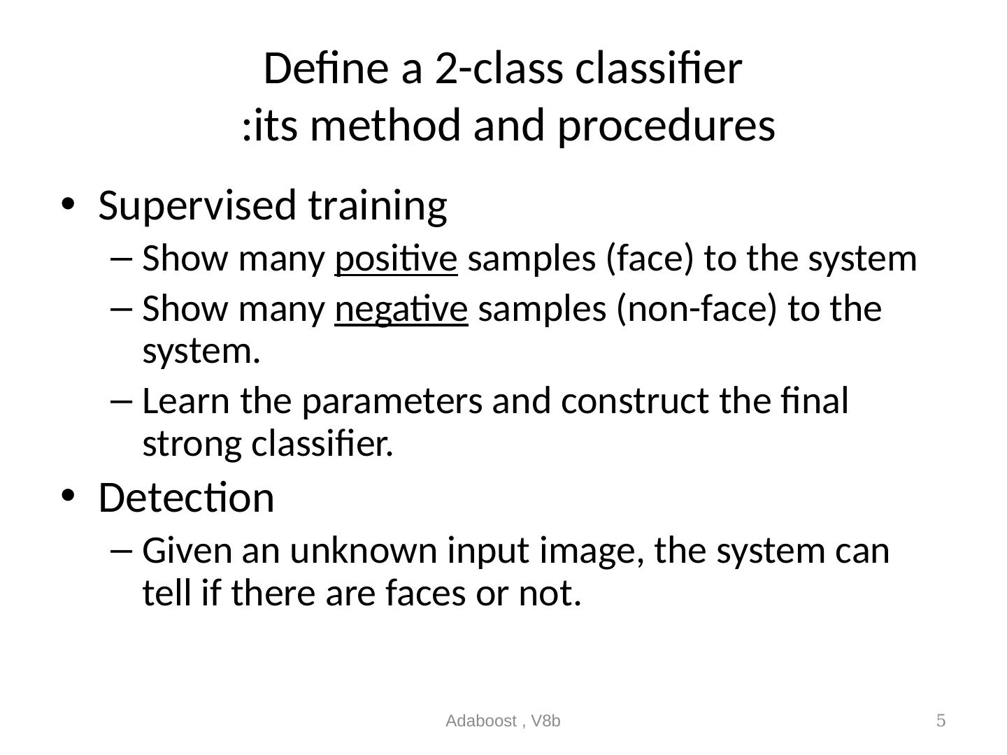 5 .Define a 2-class classifier :its method and procedures Supervised training Show many positive samples (face) to the system Show many negative samples (non-face) to the system. Learn the parameters and construct the final strong classifier. Detection Given an unknown input image, the system can tell if there are faces or not. Adaboost , V8b 5