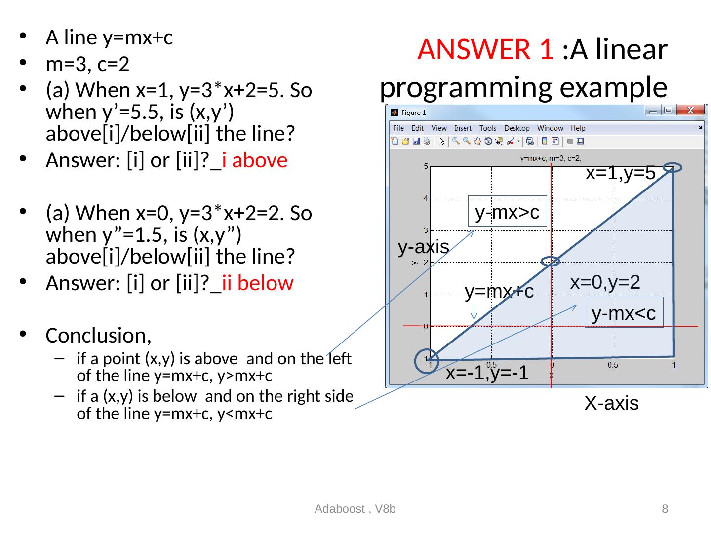 8 .ANSWER 1 :A linear programming example A line y= mx+c m=3, c=2 (a) W hen x=1, y=3*x+2=5. So when y’=5.5, i s ( x,y ’) above[i]/below[ii] the line? Answer: [i] or [ii]?_ i above (a) When x=0, y=3*x+2=2. So when y”=1.5 , is ( x,y ”) above[i]/below[ii] the line? Answer : [i] or [ii ]?_ ii below Conclusion, if a point ( x,y ) is above and on the left of the line y= mx+c , y> mx+c if a ( x,y ) is below and on the right side of the line y= mx+c , y< mx+c Adaboost , V8b 8 y-axis X-axis y=mx+c x=0,y=2 x=1,y=5 x=-1,y=-1 y-mx>c y-mx<c