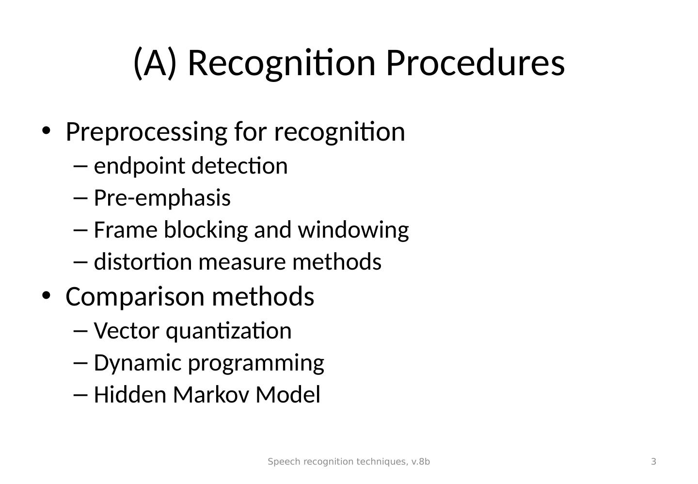 3 .(A) Recognition Procedures Preprocessing for recognition endpoint detection Pre-emphasis Frame blocking and windowing distortion measure methods Comparison methods Vector quantization Dynamic programming Hidden Markov Model Speech recognition techniques, v.8b 3