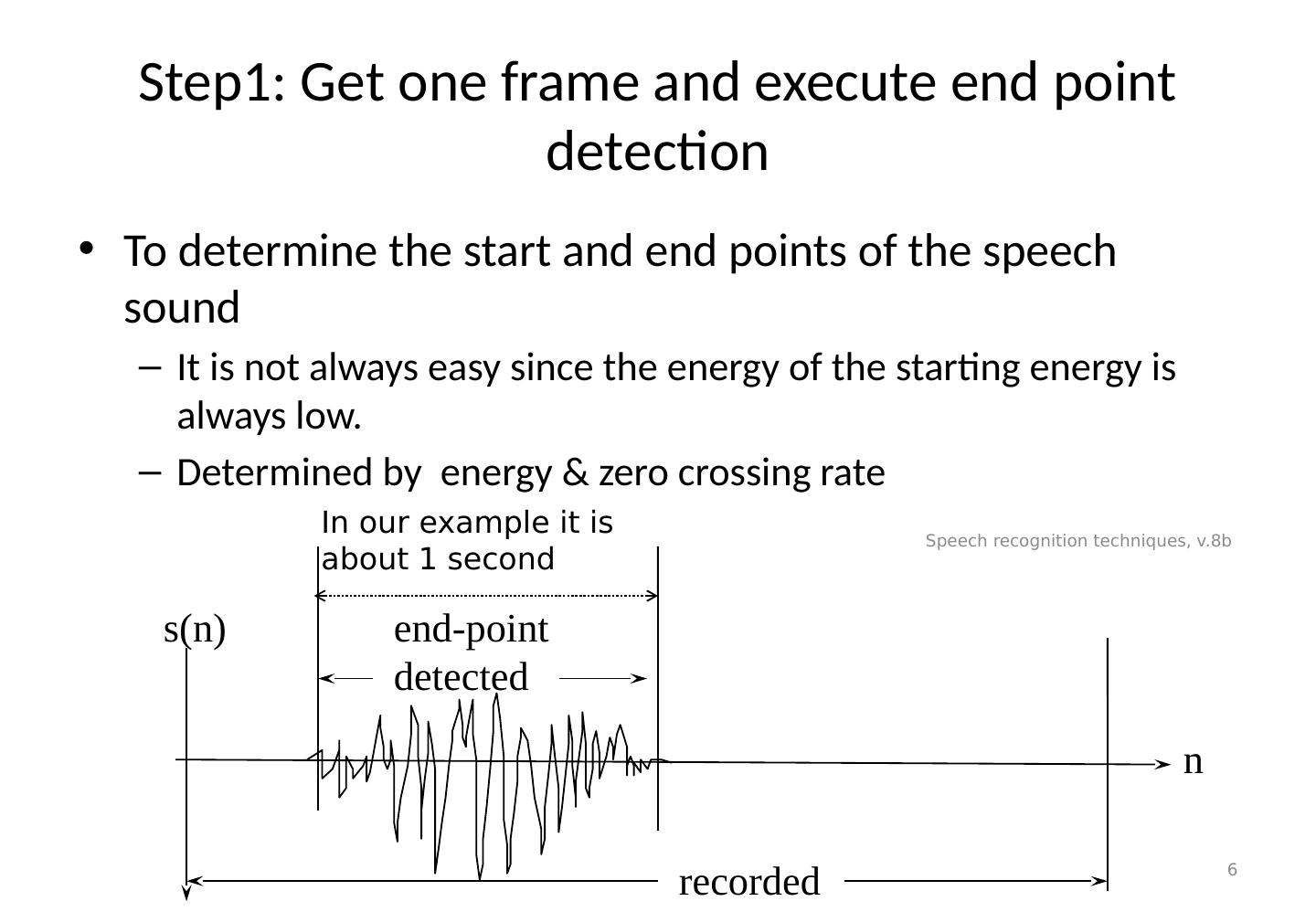 6 .Step1: Get one frame and execute end point detection To determine the start and end points of the speech sound It is not always easy since the energy of the starting energy is always low. Determined by energy & zero crossing rate Speech recognition techniques, v.8b 6 recorded end-point detected n s(n) In our example it is about 1 second