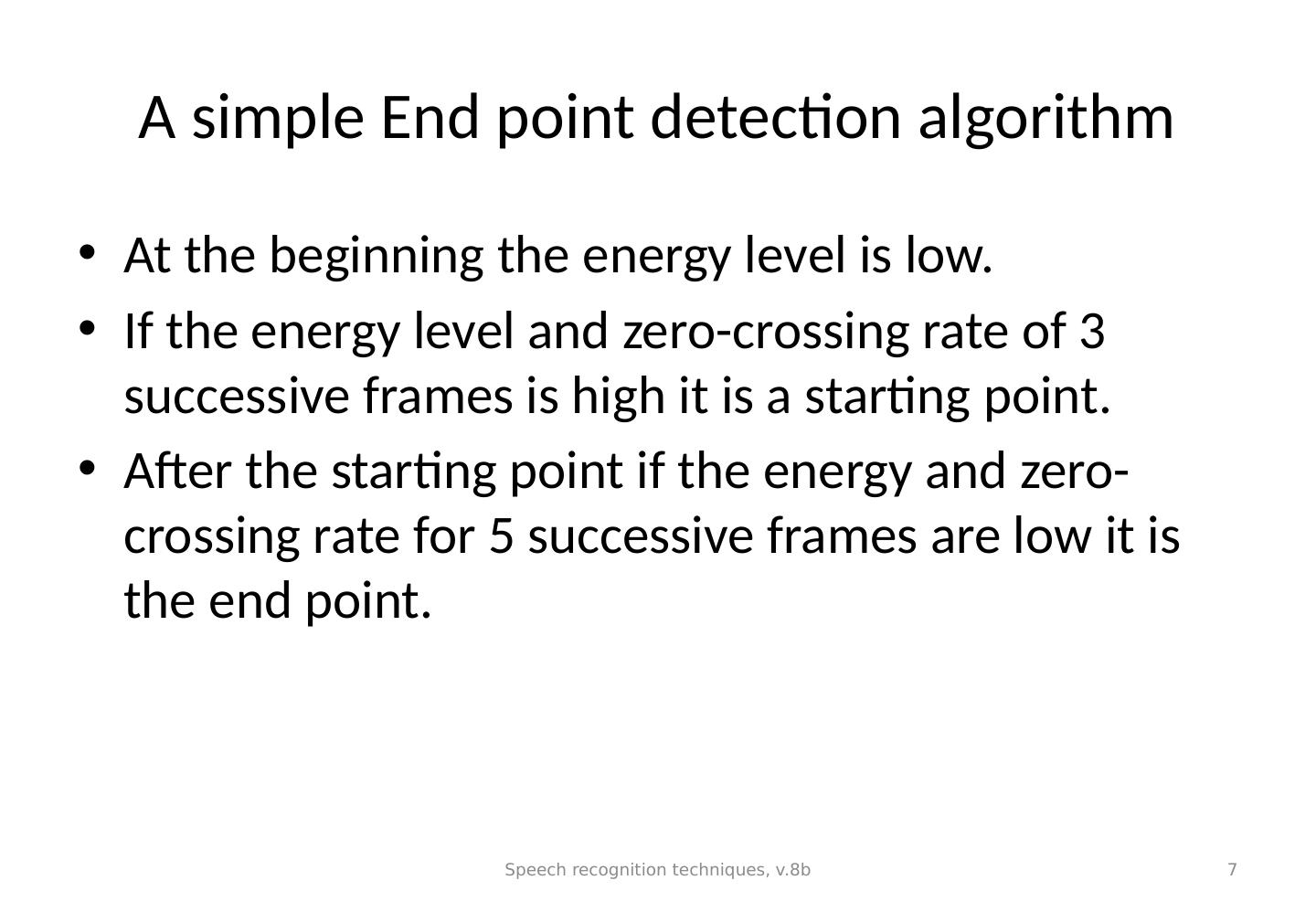 7 .A simple End point detection algorithm At the beginning the energy level is low. If the energy level and zero-crossing rate of 3 successive frames is high it is a starting point. After the starting point if the energy and zero-crossing rate for 5 successive frames are low it is the end point. Speech recognition techniques, v.8b 7